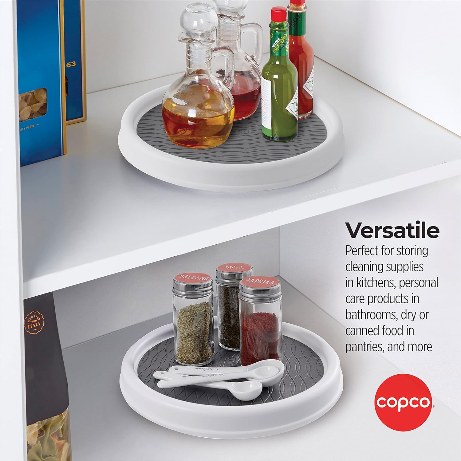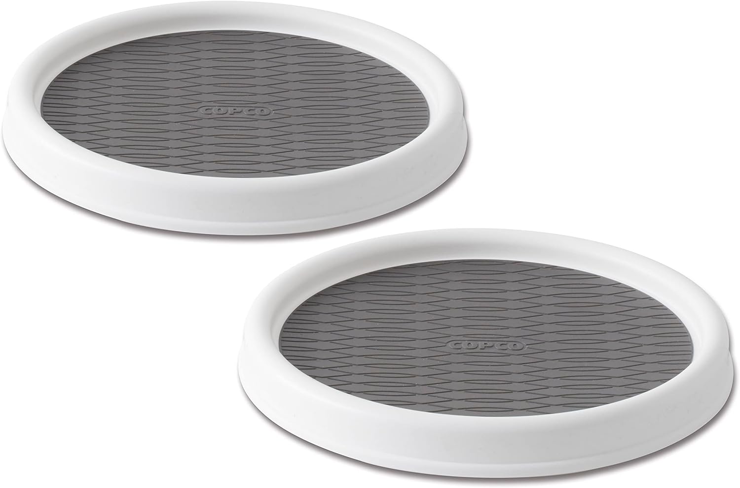 Copco 9 Inch Non Skid Pantry Cabinet Lazy Susan Turntable, Set of 2, Spinning Organizer for Kitchen, Countertop, or Bathroom, White and Gray