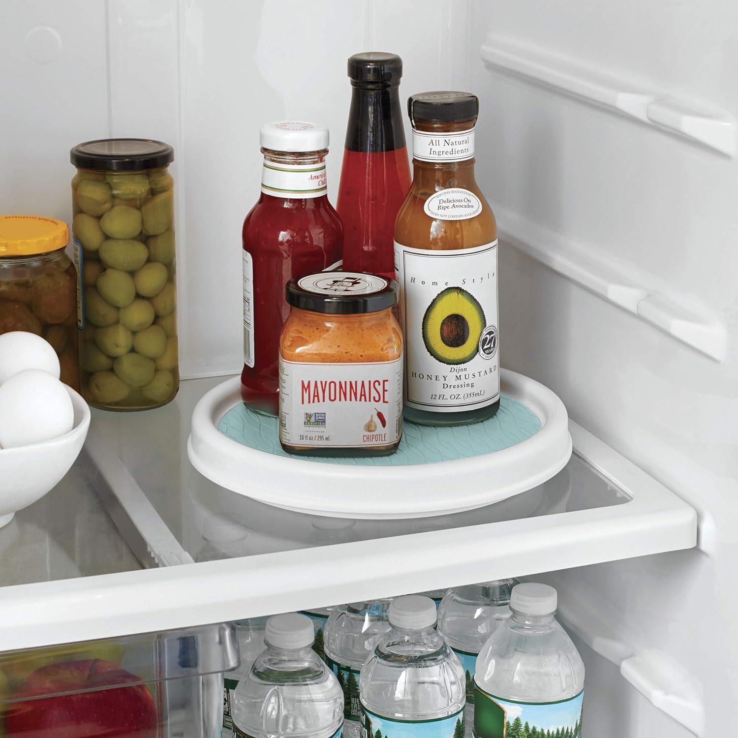 - MAXIMIZE STORAGE: Stylish 9-inch aqua sky turntable makes countertops, cabinets, closets, and even your refrigerator more organized and tidy "