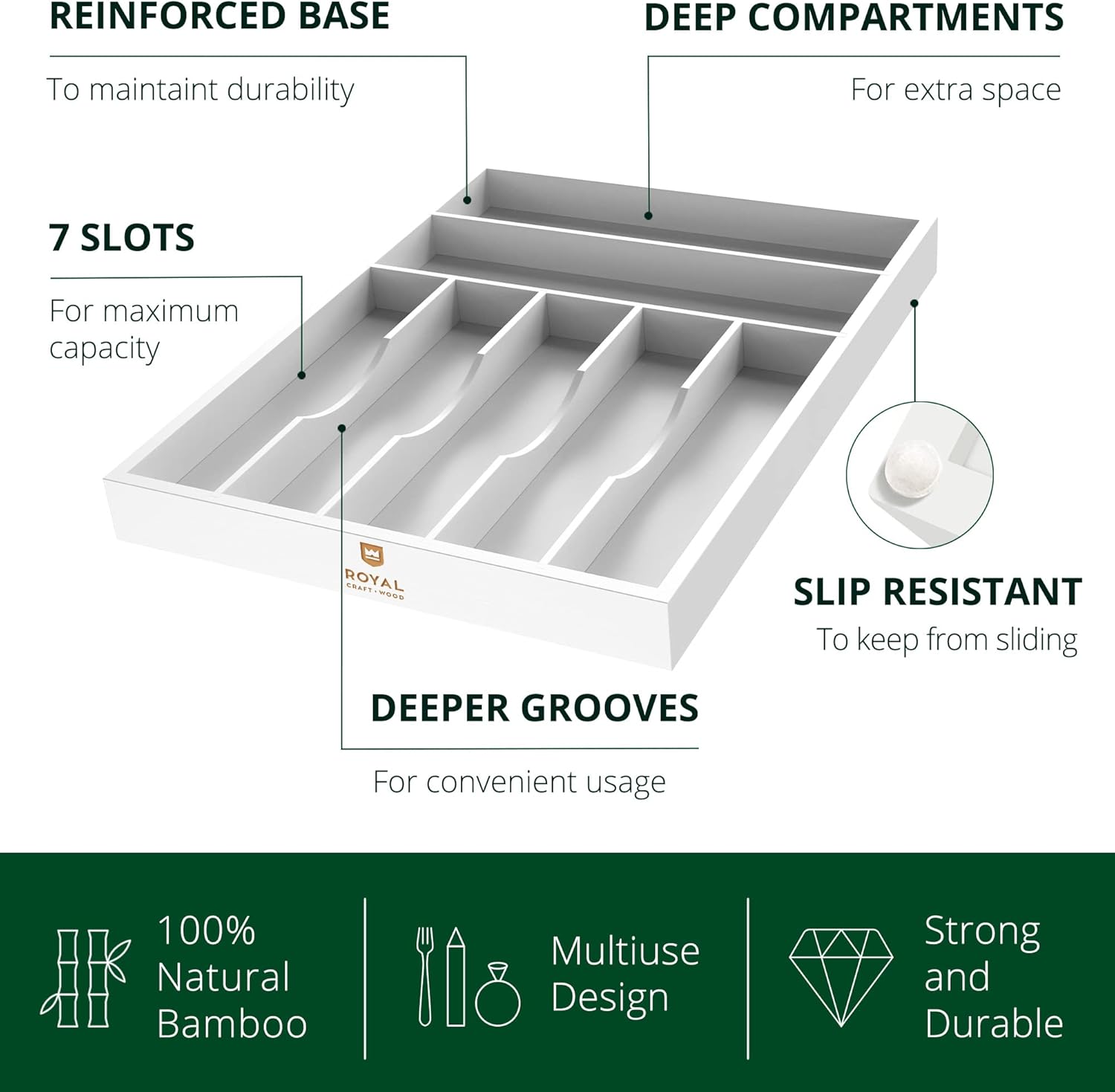 ROYAL CRAFT WOOD Luxury Bamboo Kitchen Drawer Organizer - Silverware Organizer - Utensil Holder and Cutlery Tray with Grooved Drawer Dividers for Flatware and Kitchen Utensils (7 Slot, White)