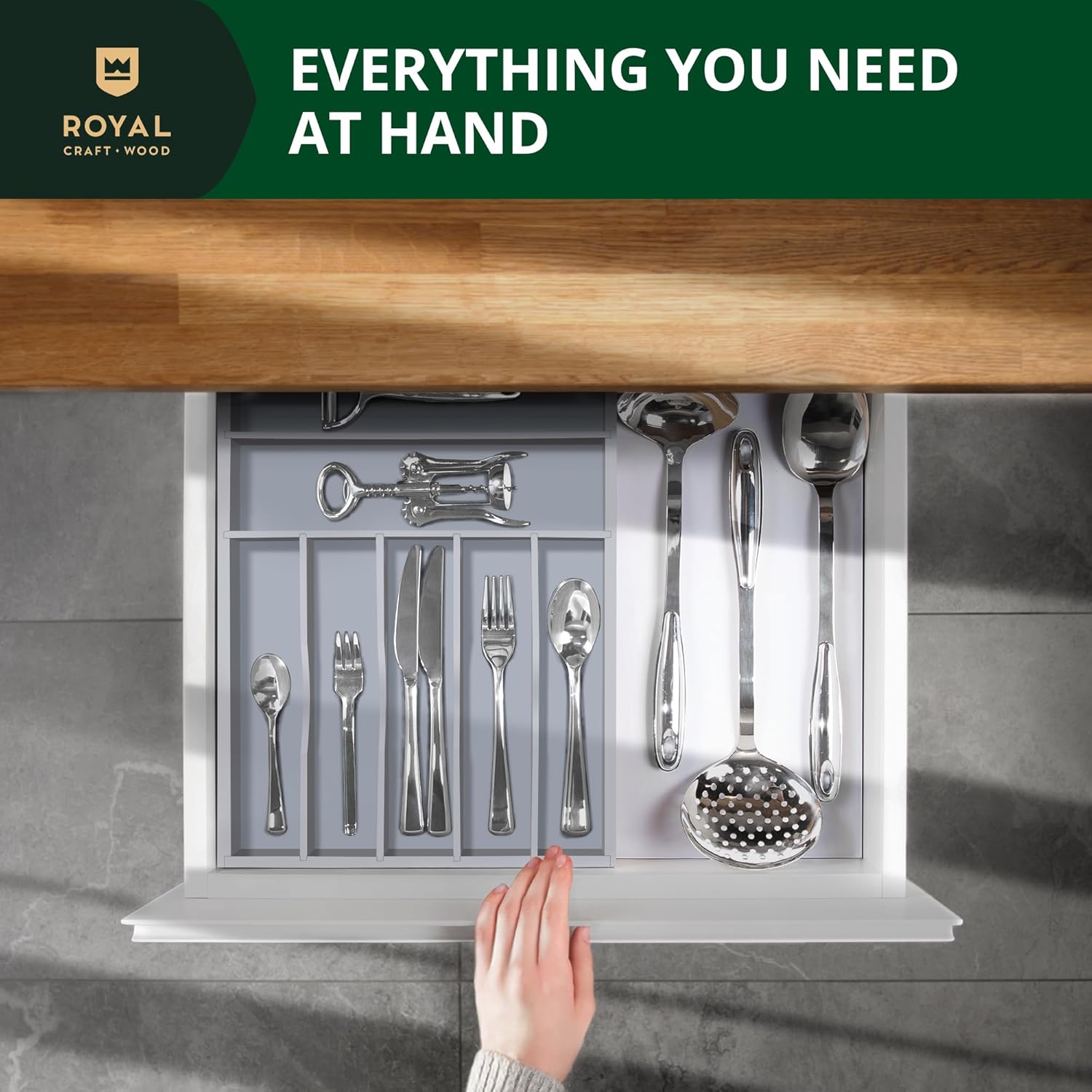 - 🧽𝐄𝐀𝐒𝐘 𝐓𝐎 𝐔𝐒𝐄, 𝐋𝐎𝐖 𝐌𝐀𝐈𝐍𝐓𝐄𝐍𝐀𝐍𝐂𝐄: Super easy to use, simply set the Royal Craft Wood Cutlery Tray with Drawer Organizers in your clean, empty drawer and fill with anything you’d like from kitchen utensils such as spoons, forks, tongs, spatulas, or steak knives to desk essentials like your stapler and staple refills, paper clips, erasers, and more. Easy to maintain, all you need to do is wipe clean with just a damp cloth, and your silverware drawer organizer will be as good as new