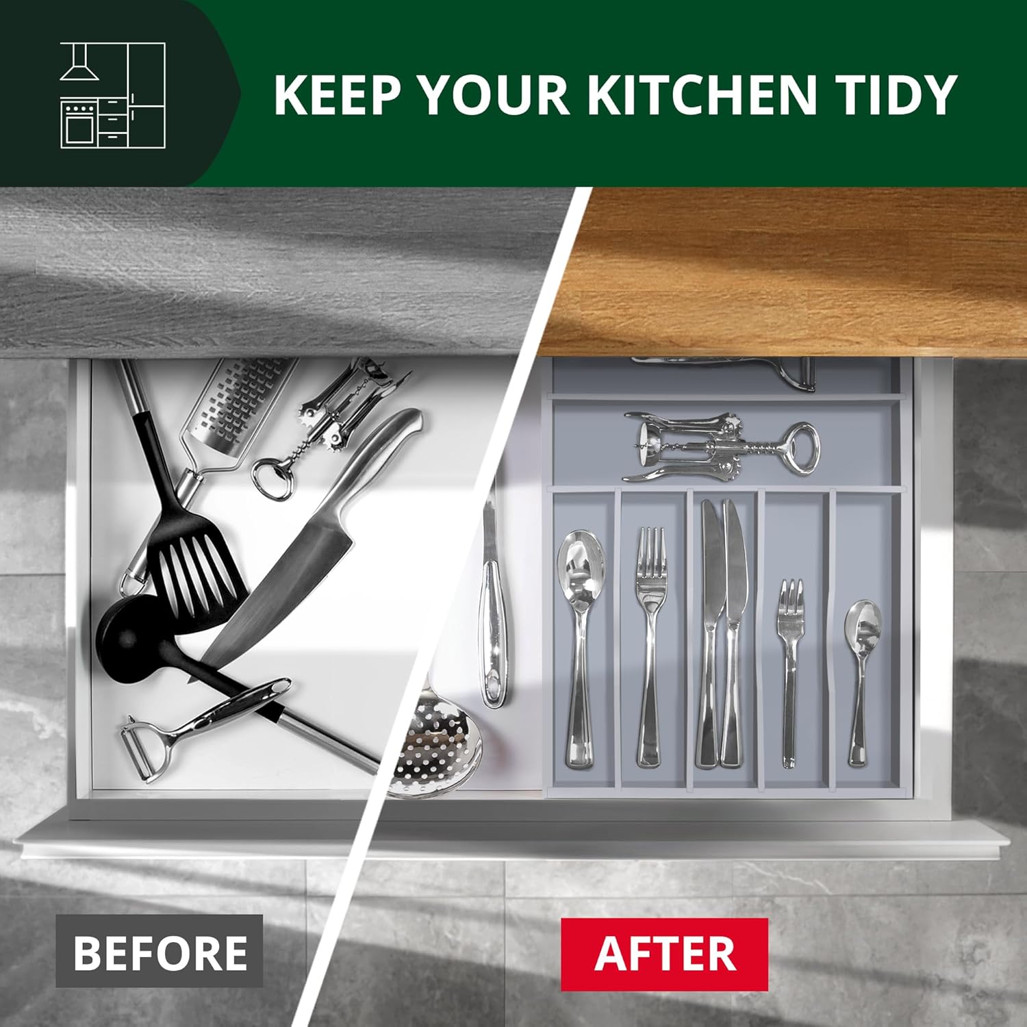 - 📐𝐃𝐄𝐄𝐏 𝐒𝐓𝐎𝐑𝐀𝐆𝐄 𝐂𝐎𝐌𝐏𝐀𝐑𝐓𝐌𝐄𝐍𝐓𝐒 𝐀𝐍𝐃 𝐑𝐄𝐈𝐍𝐅𝐎𝐑𝐂𝐄𝐃 𝐁𝐀𝐒𝐄: 1.9” deep dividing slots help maximize drawer space, allowing you to fill each section with more kitchen gadgets and tools. Keep everything you need conveniently at hand when cooking, neatly visible and easy to grab when running around the kitchen preparing your next meal. With a reinforced base, the kitchen storage organizing container is durable and reliable for long term use, perfect to support the weight of your heavy duty cutlery and knives