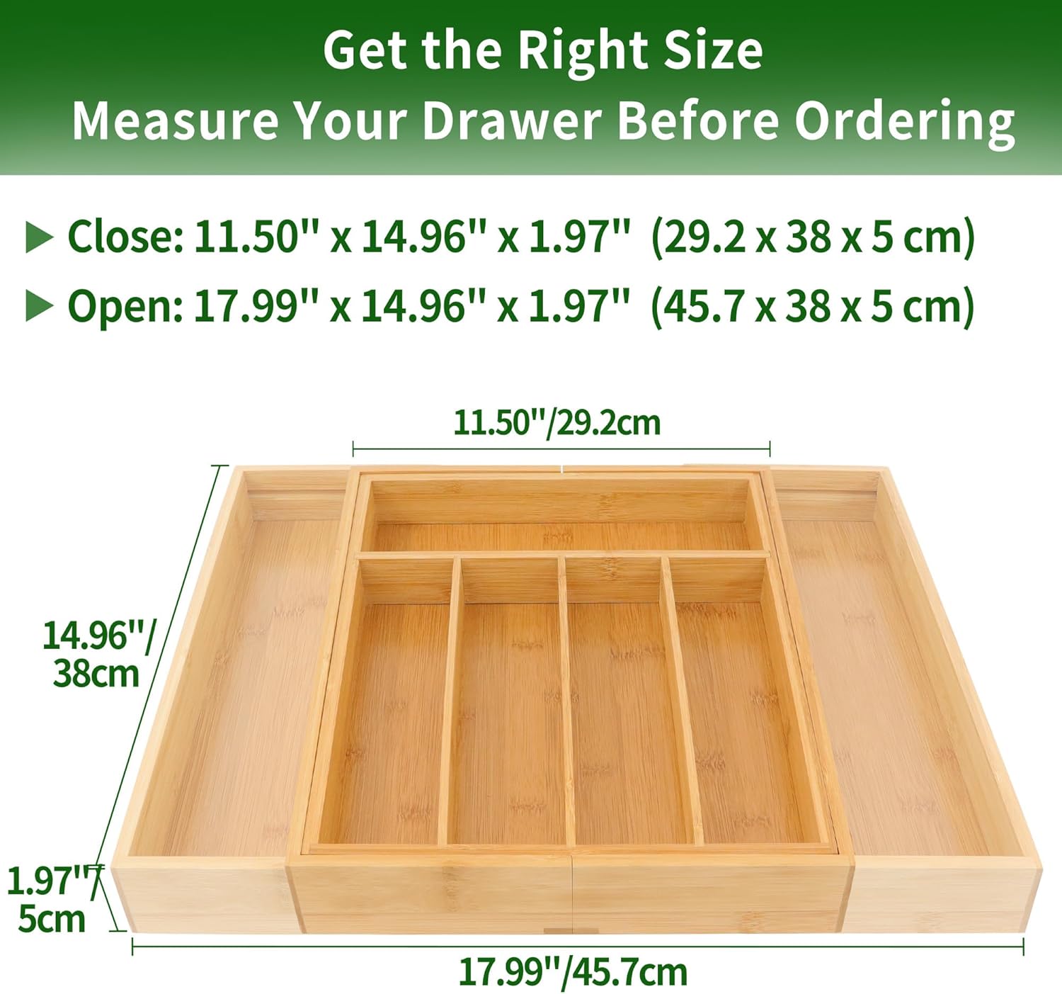 - Bamboo Material: Our kitchen bamboo silverware drawer organizer is made of moso bamboo; The beautiful color and the timeless design make it fit perfectly into your home decor
