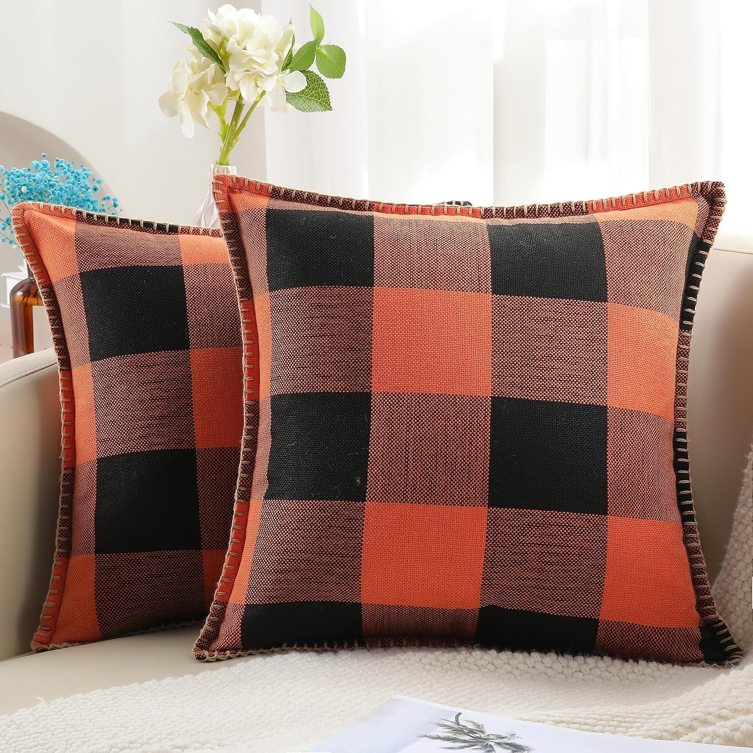 decorUhome Fall Orange and Black Decorative Throw Pillow Covers 16x16 Set of 2, Buffalo Plaid Check Farmhouse Cushion Covers with Stitched Edge for Autumn Harvest Couch Sofa Bed Home Decor