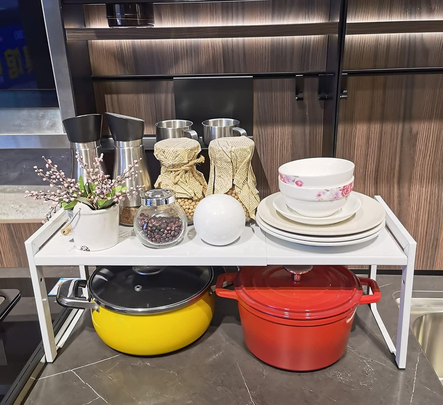 Expandable Cabinet Shelf Organizer 16-26" L Stackable Kitchen Counter Shelf Rack Stand Sink Riser Countertop Storage White (Normal 7.9”D)