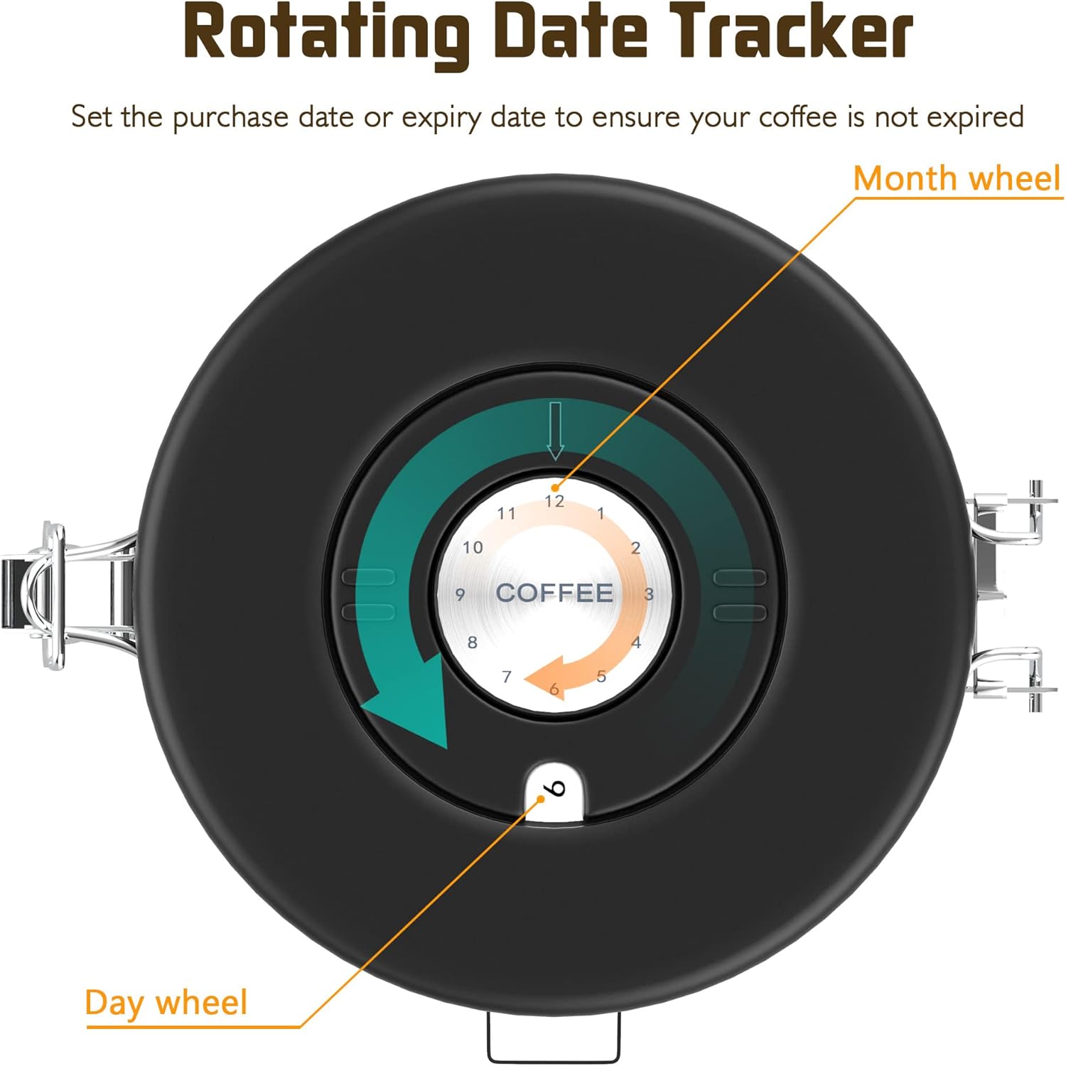 - 【Date tracking and airtightness】The coffee canister is designed with a lock, the lid is equipped with a silicone gasket, and there is a date tracking wheel on the top of the lid. The shelf life can be set when the coffee is loaded. The next time you open it, you will know how long it will be stored.