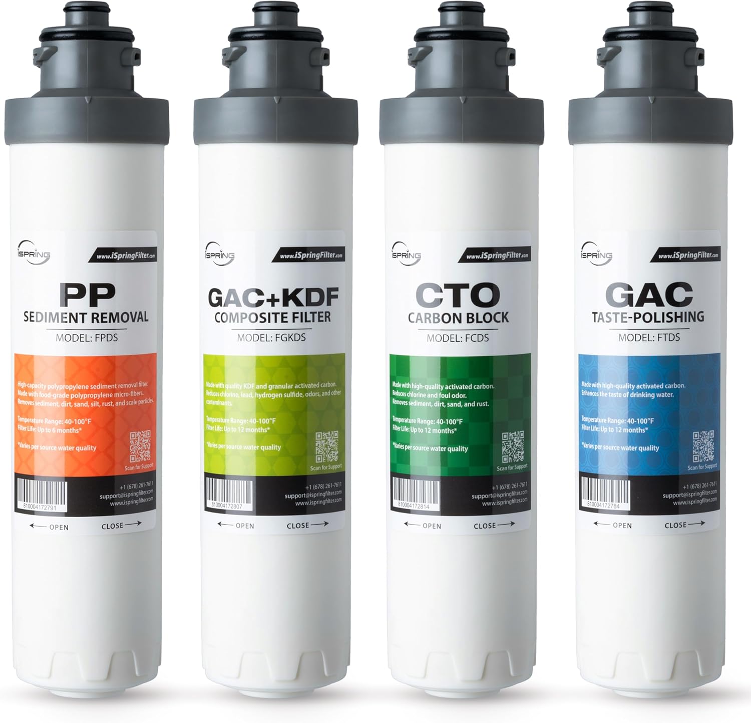 - HIGH QUALITY FILTERED WATER - iSpring F4DS filter replacement pack includes 4 pieces of 10" x 2. 5" replacement water filters included: 1x Sediment filter, 1x Compound filter, 1x Carbon block filter and 1x Post Carbon Filter . These filter cartridges are efficiently designed to reduce dust particles, foul smelling gas and will also improve the taste of water.