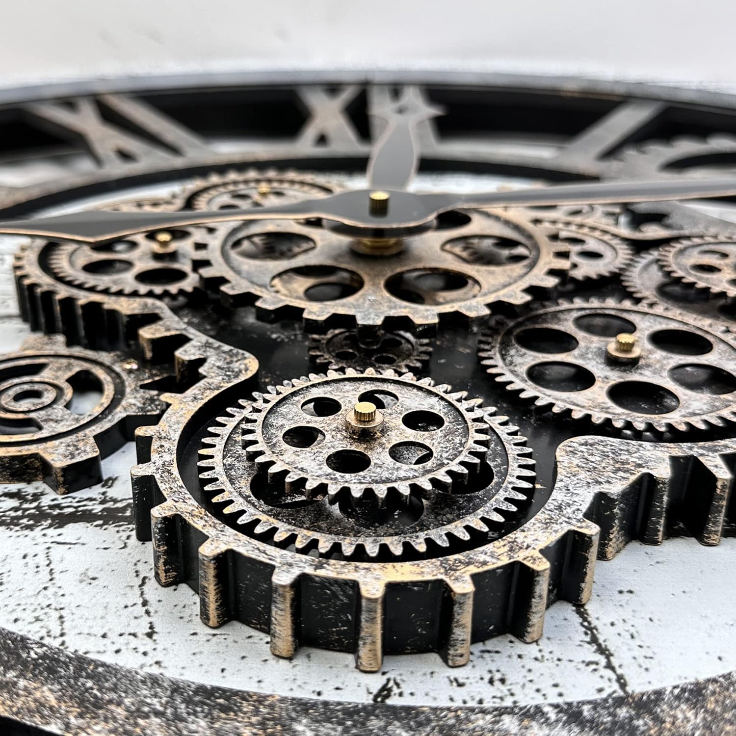 - 【Real Moving Gear Clock】All gears for the wall clock are real moving! Design with rustic bronze-color and industrial style. An creative combination of four gears for a retro look, has a very exquisite decorative effect makes the wall clock become a chic art works. The large wall clock crafted of nature wood & MDF. Big roman numeral numbers and wood rustic moving gears perfect for any room decor.