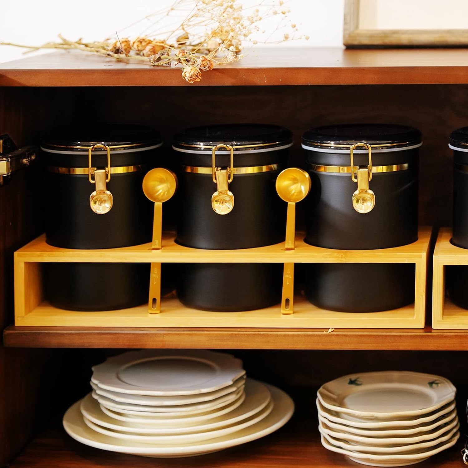 Yangbaga 304 Stainless Steel Coffee Canisters for Ground Coffee,3 x 63 OZ Coffee Container with Shelf Coffee Bean Storage, Food Storage Jar with Gold Airtight Locking Clamp and Spoon for Kitchen