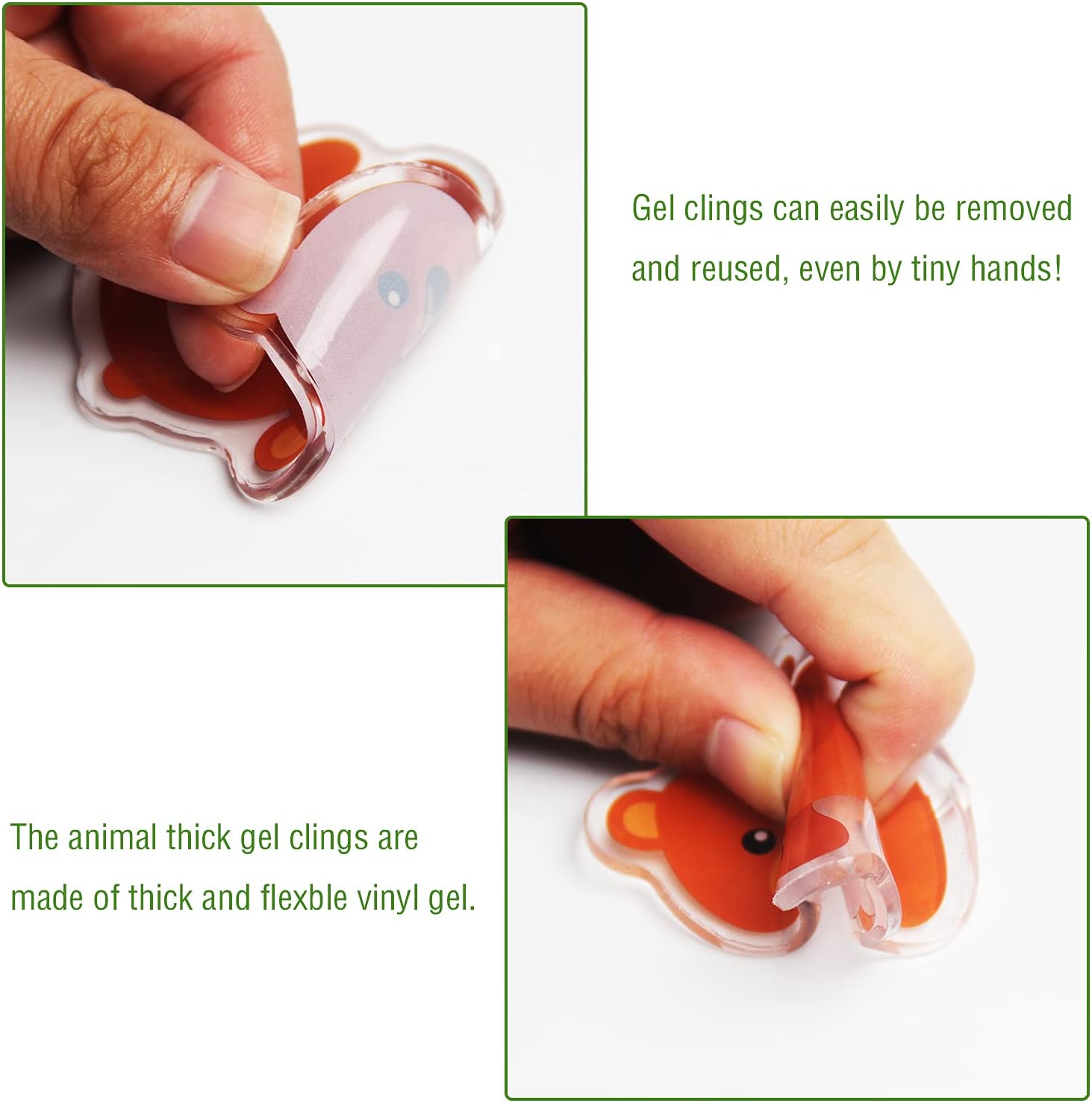- Note: The safari thick gel clings are not edible.These thick gel window clings are suitable for children 5 years old and above to play, there is a risk of suffocation, need to be accompanied by an adult when playing.