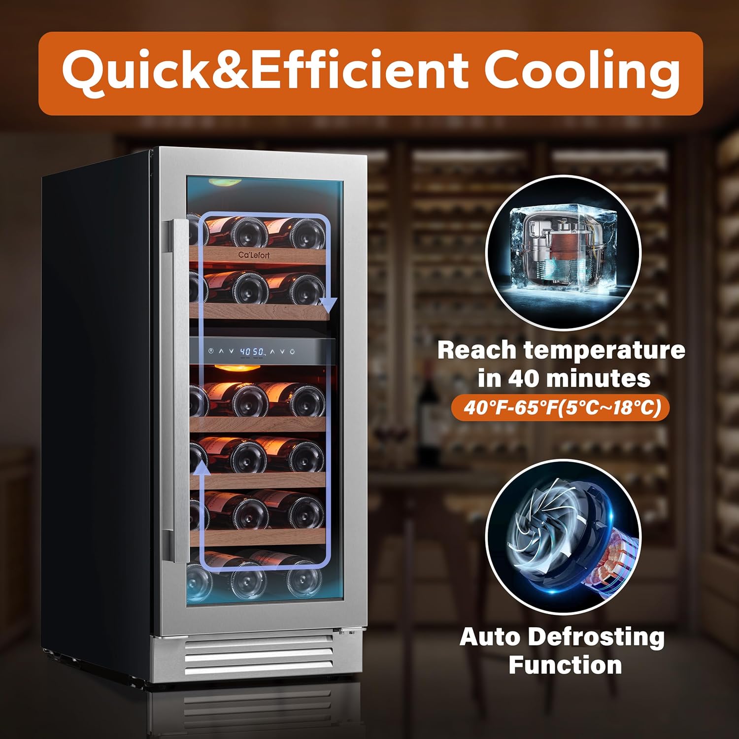 - 【Dual Zone Wine Refrigerator】Ca'Lefort Wine Fridge 3.00 cu.ft capacity holds at least 28 bottles of wine (standard 750ml). The minimum temperature is 40°F, with the smart digital panel, you can adjust the temperature accurately by 1°F. The hardness, eco-friendly and durable removable shelves (made of sapele wood) make it easy to access the red wines, and by adjusting the shelves, you can place different sizes of red wines. You can choose the amber/blue/white LED according to different moods.