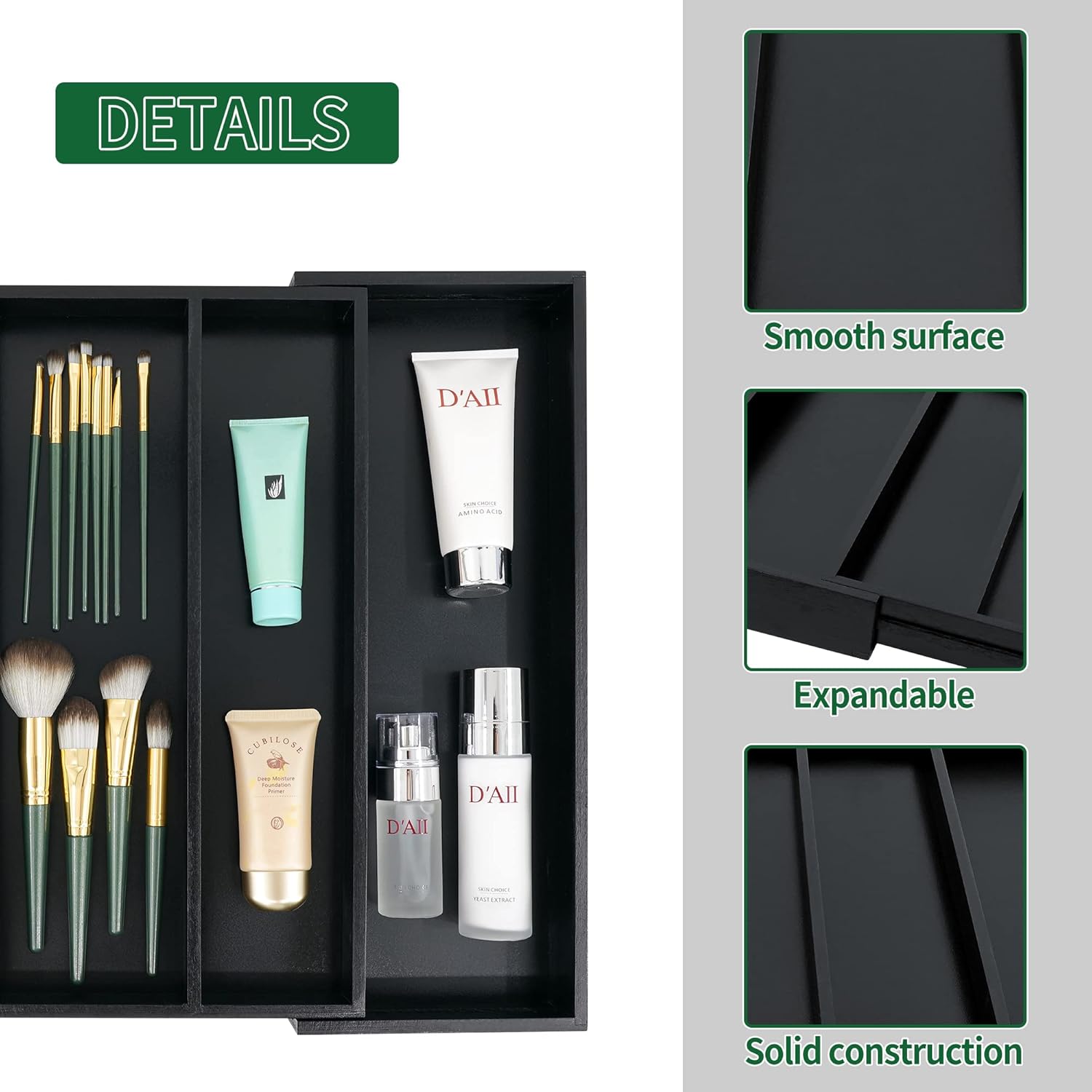 - Widely Use: The expandable drawer organizer can be used to store small items such as jewelry, tools, spoons and knives. also it can be made a good use in the bedroom or bathroom with holding personal items like hair ties, jewelry and other accessories