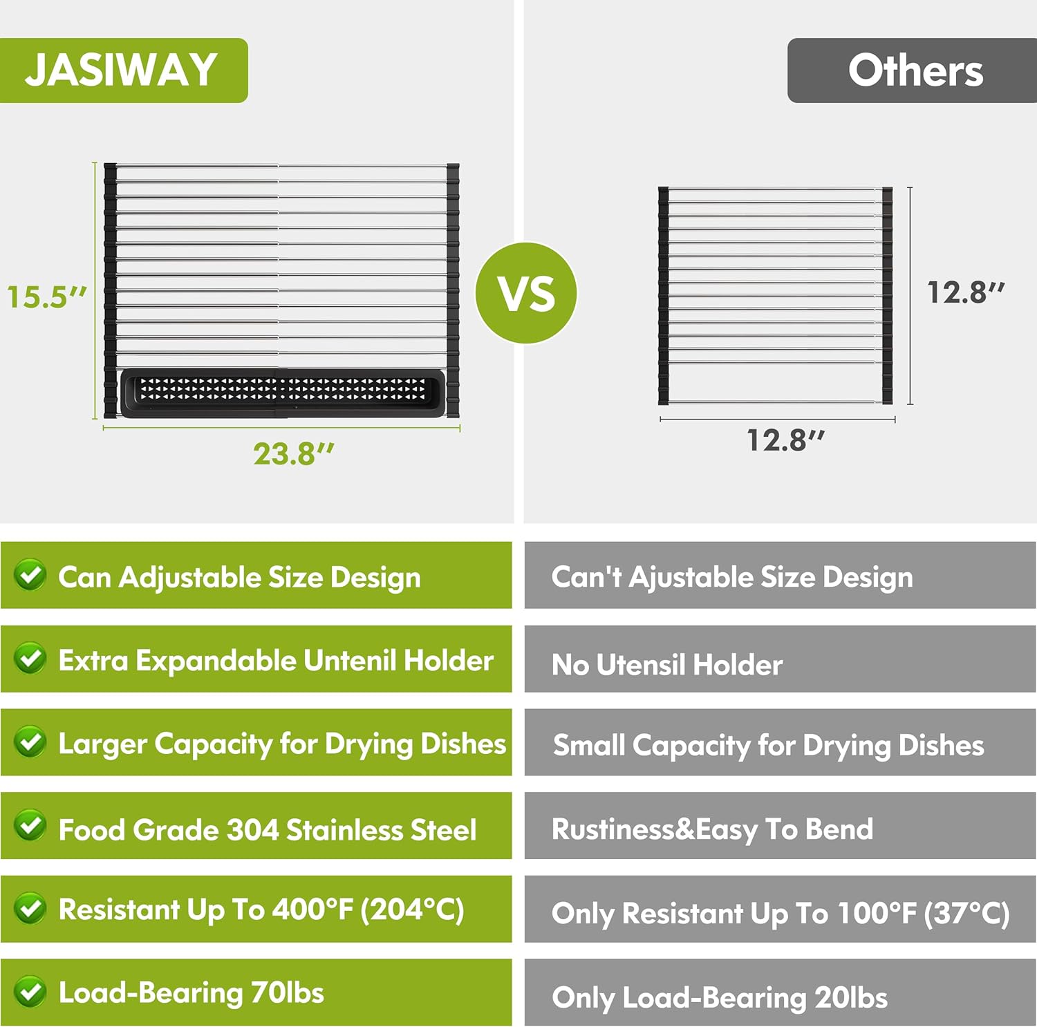 - Space Saving & Easy to Store: This expandable dish drying rack is using on the sink, which doesn't take up your usual counter space, and the water will drip directly into the sink. The drying rack for kitchen sink can easily rolled up for storage when it is not in use, leaving the sinks and kitchen counter keep neat and organized. This over the sin drying rack will be the best parter in the kitchen organization and storage