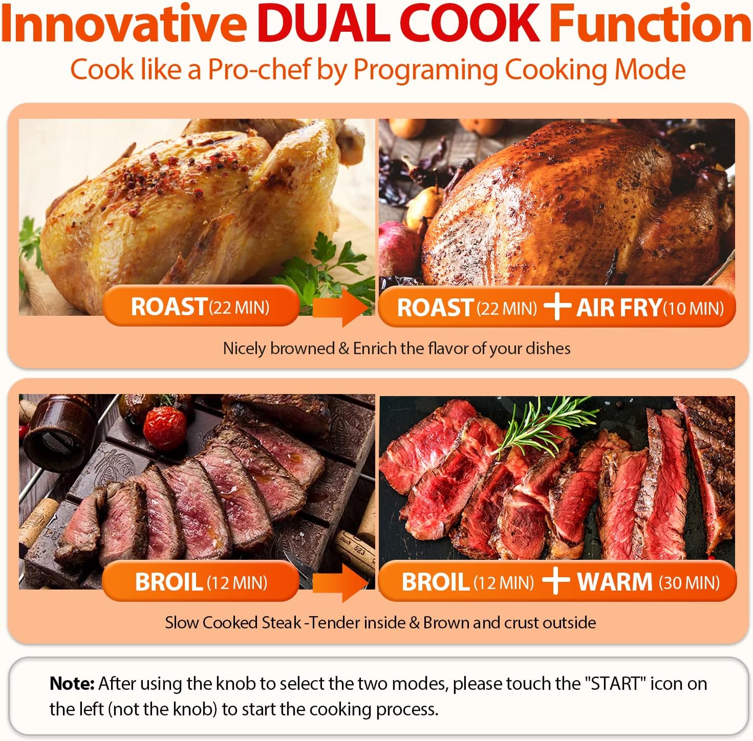 - 【Fast & Even cooking, Less-oil, Crispy】The convection fan of air fryer generate 360°hot airflow produces crispier exterior and moist tender interior with less oil,providing you with perfect taste and healthy diet. The innovative dual cook function enables you to combine any two functions in preset. Make Complex recipes effortless and rich the dish's flavor.Double Glass door heat insulation reduces heat loss effectively reduces preheat time.