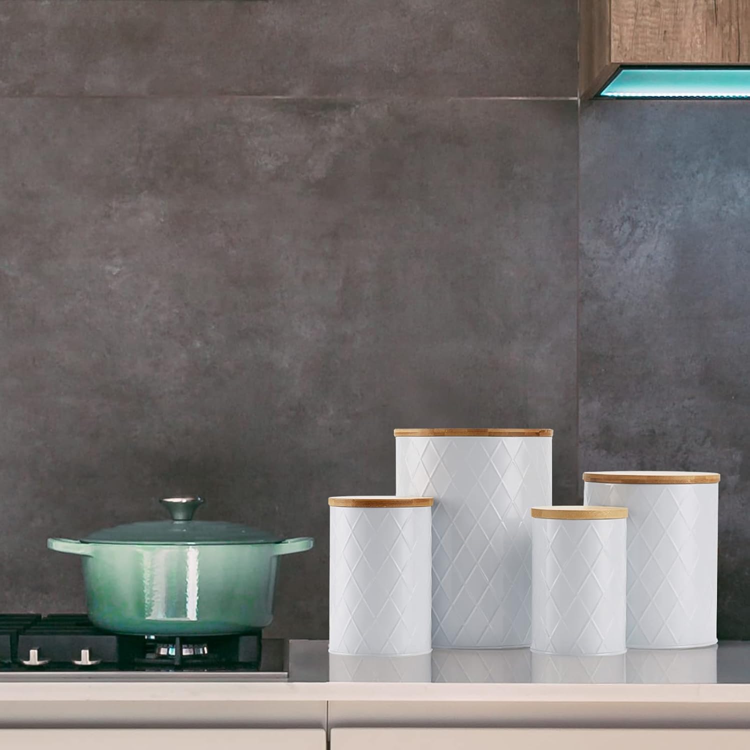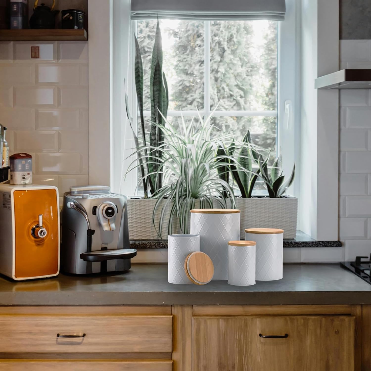 - Airtight Kitchen Container Set for Countertop - Made of eco-friendly bamboo and thickened metal, no bending. BPA-Free silicone gasketed airtight lids keep your food fresh and delicious.