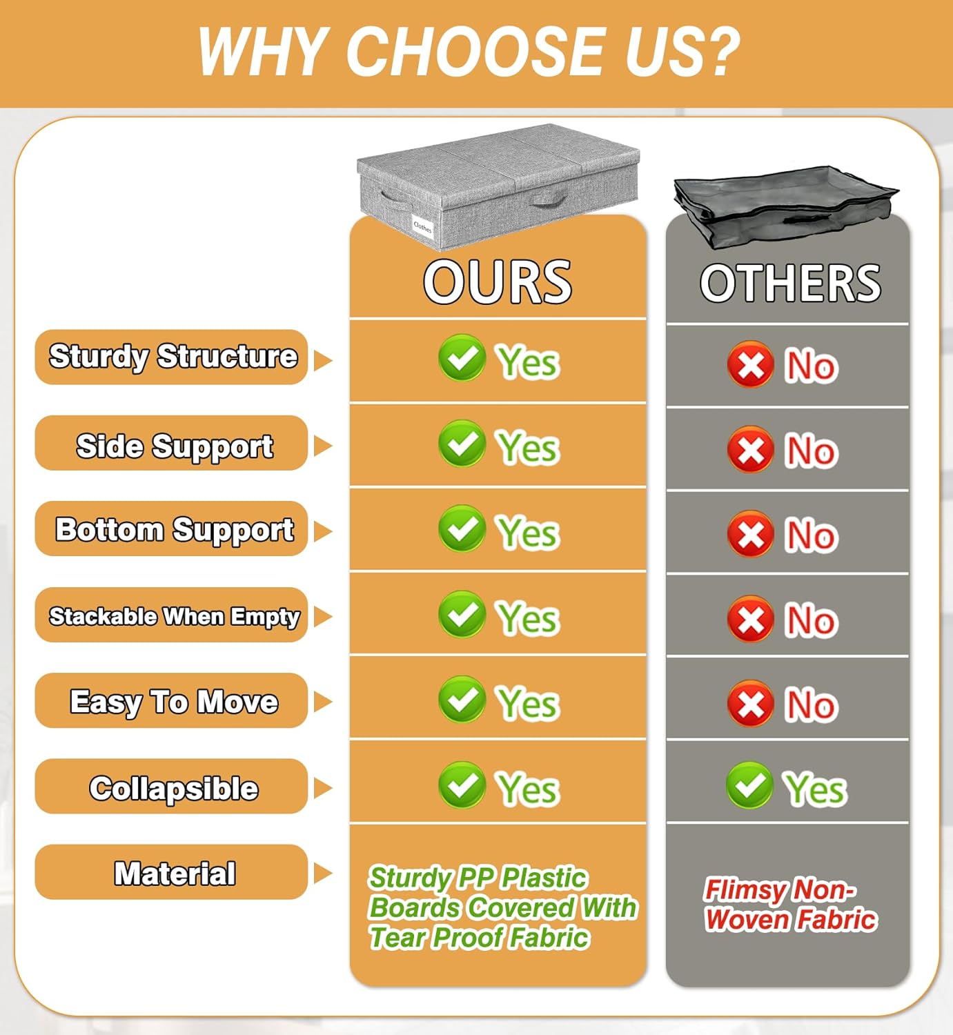 - STURDY STRUCTURE & DURABLE HANDLES: 3 Reinforced sewn-in handles make it easy maneuverability and convenient for you to carry and pull out from under the bed; handy bins make excellent underbed storage box; Lasts longer than under bed clothes storage organizer; Keep your bedroom neat and tidy with storage bins with lids that fit your room's existing decor and theme