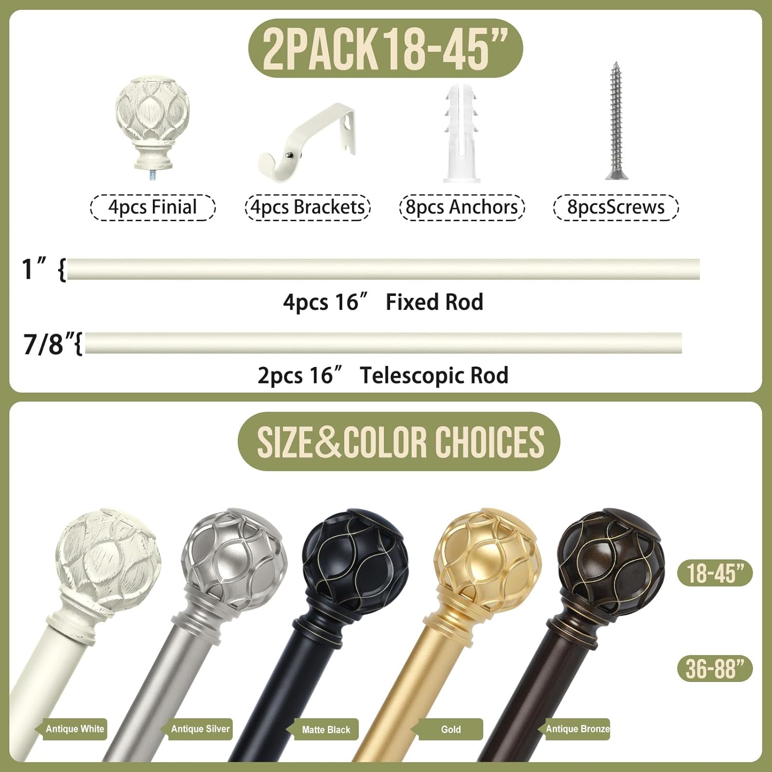 - 2 Pack Curtain Rods for Windows 28 to 48 inch(2.3-4ft): TANGWIN drapery rods include 4 x 16" x 1"fixed rods, 2 x 16" x 7/8"adjustable rods, 4 x finial, 4 x bracket, 2 x connector, 8 x anchor, 8 x screw. 2 Pack antique white curtain rods for windows can extend from 18 to 45 inches, choose the right size curtain rods according to the length of your window.