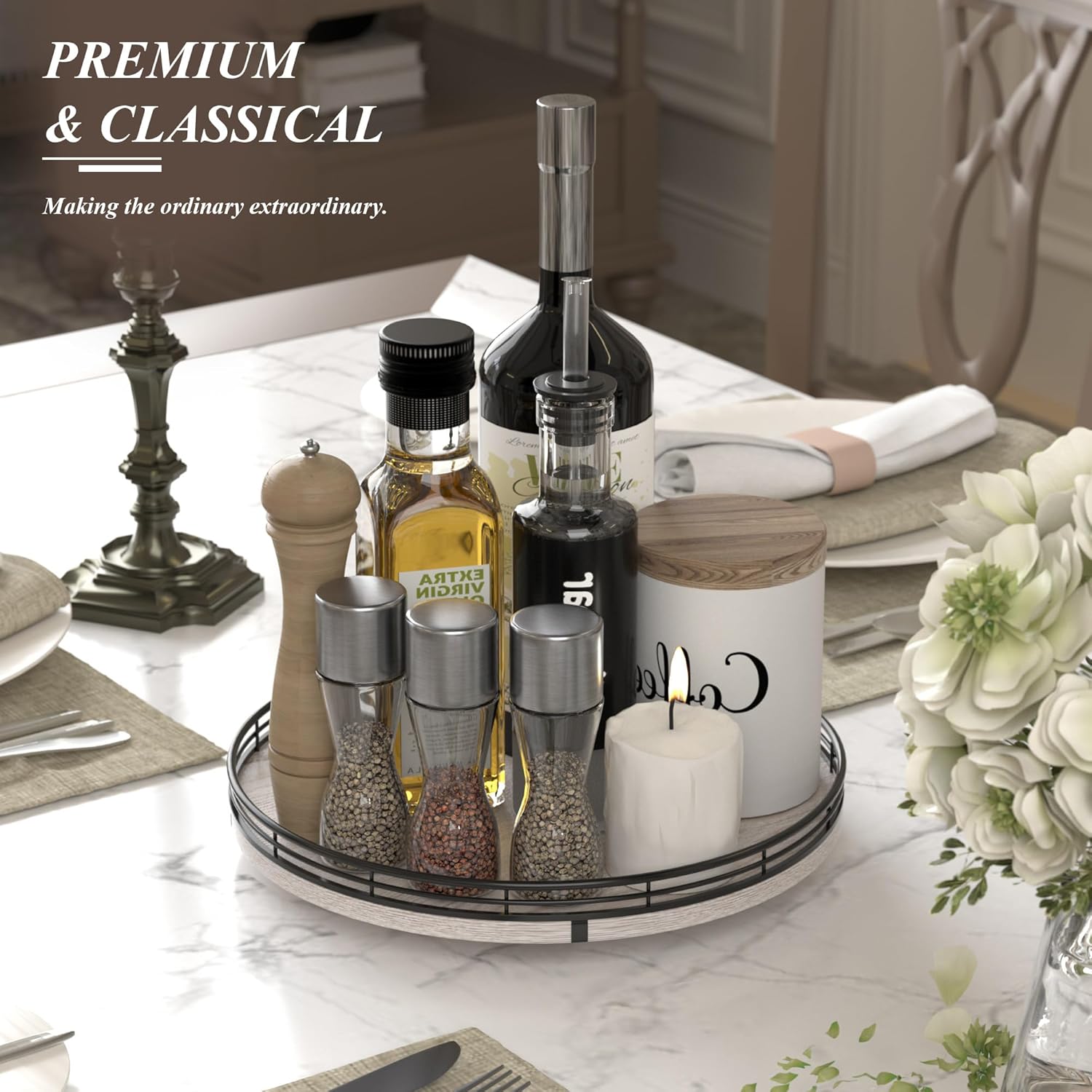 12" Farmhouse Lazy Susan for Kitchen & Coffee Table Decor β Rustic Wood Tray with Black Metal Frame, Decorative Centerpiece for Dining Room, Ottoman, Living Room, Serving or Vanity Use
