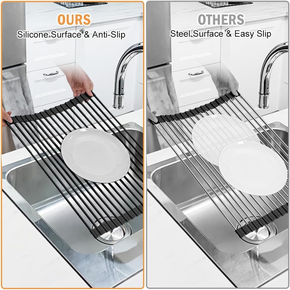 - Space Saving and Folable Design: Save your counter space by placing it over the sink to put your dishes, bottles, cups, pots., etc. It is foldable and can be rolled up for easy storage. A great life gadget as kitchen sink organizer and apartment must haves.