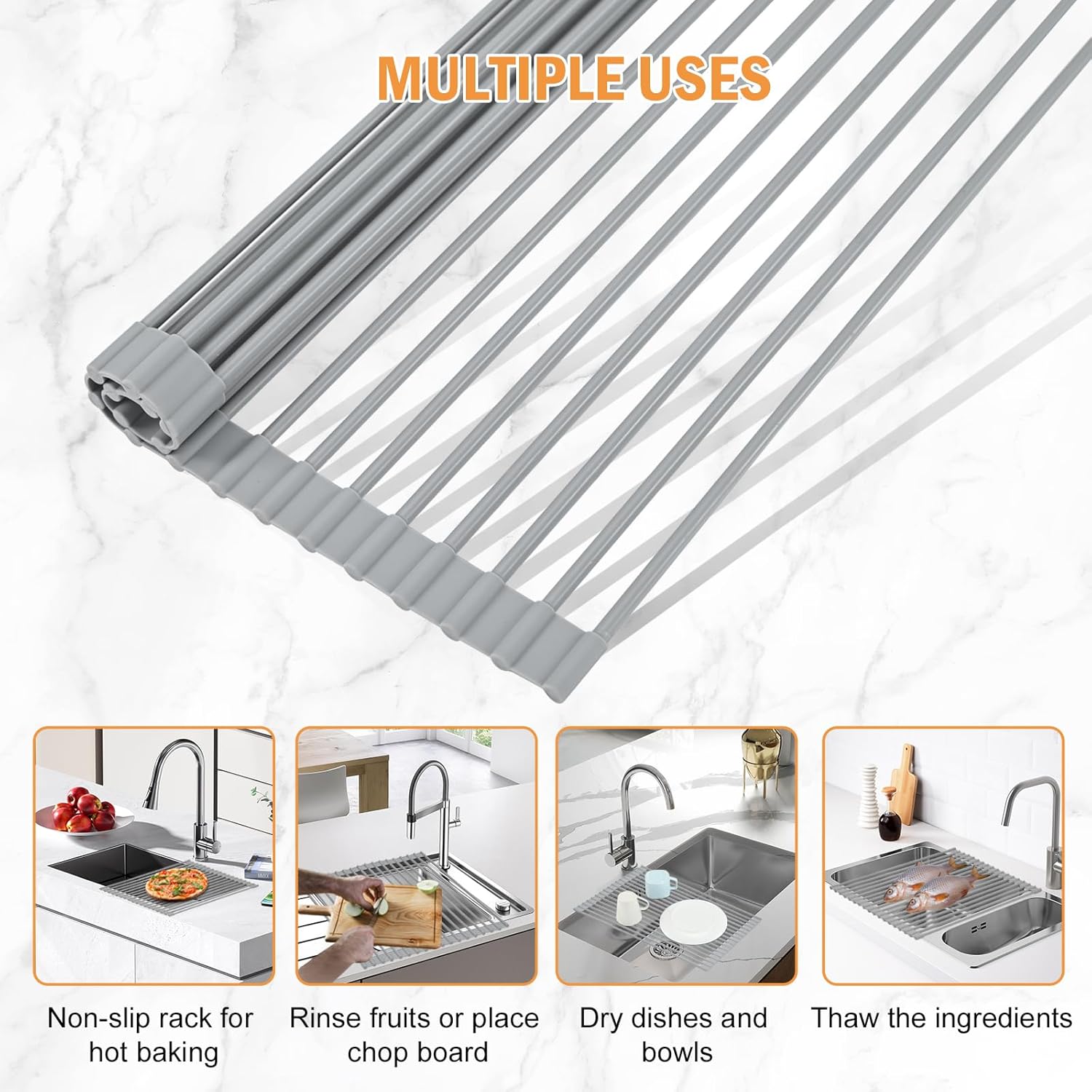 - Durable and Solid Material: This Roll Up Dish Drying Rack is made from 18 high quality Silicone-wrapped Stainless Steel bars, this Dish Drying Rack is resistant to rust / corrosion, and dishwasher-safe. It can bear the load of up to 80 lbs, ensures long-term durability without any surface damage and deformation.