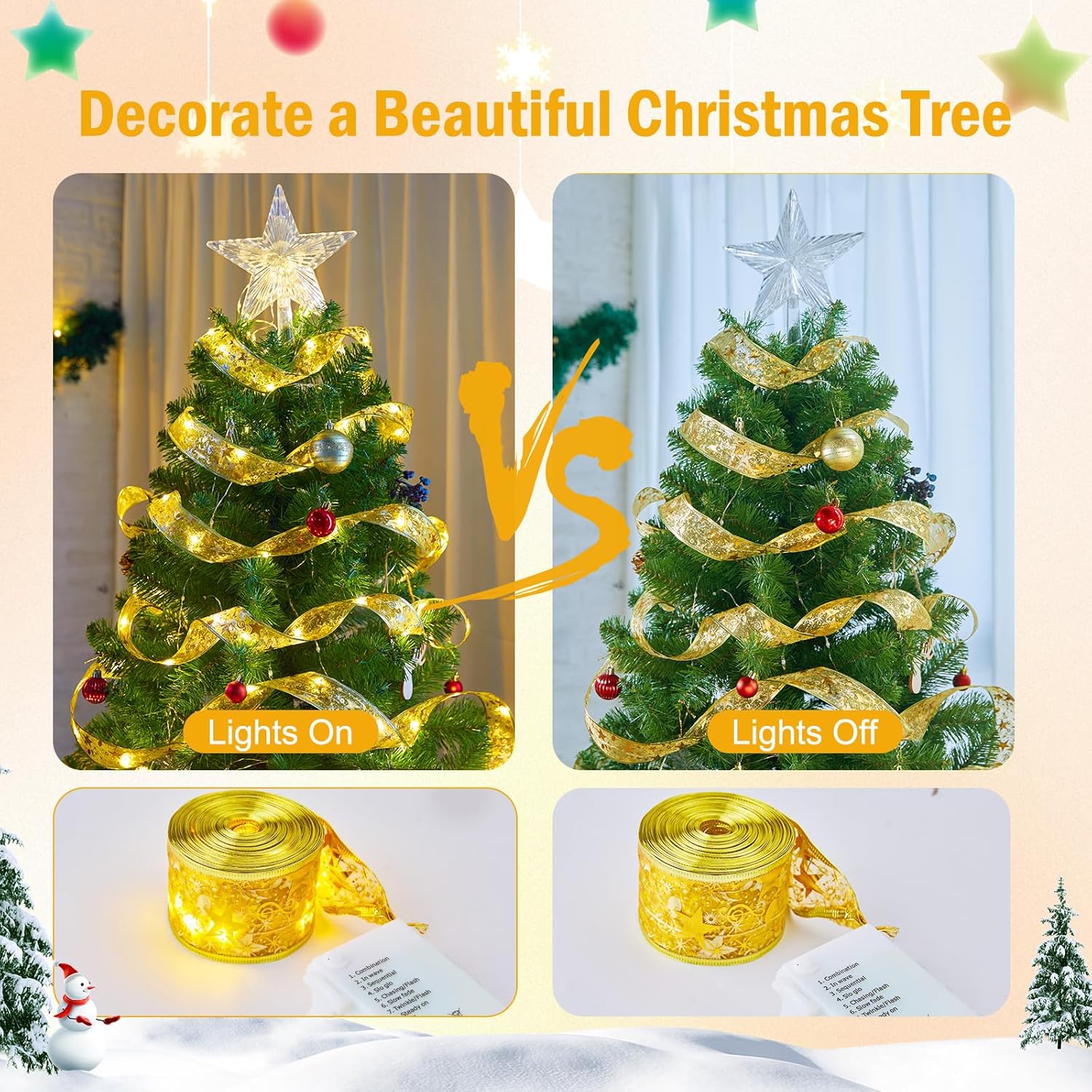 - 【 LED Christmas Ribbon String Lights 】- Powered by 3 × AA batteries, these ribbon string lights specially designed for Christmas trees are 33 feet long with 100 bright LEDs. The beautiful ribbon pattern and medium-sized LED bulbs add a cheerful and romantic touch to your Christmas Tree.