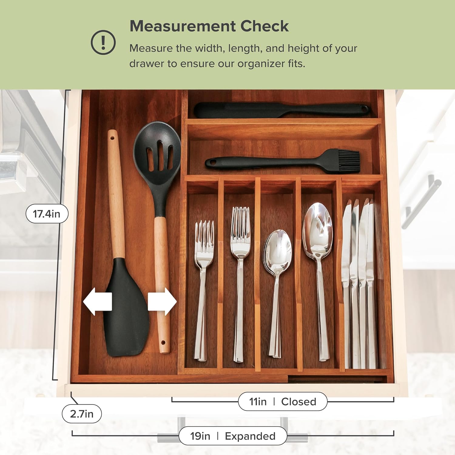 - Ideal For Smaller Drawers (DIMENSIONS): Specifically tailored for compact kitchen drawers, our narrow organizer now fits perfectly with dimensions of 17.4 inches by 11 inches. It measures 17.4 inches in length (front to back) and 2.7 inches in height, expanding from 11 inches to a maximum width of 19 inches. Note: the drawer’s interior must be at least 17.5 inches (front to back) for proper fitting. Please ensure accurate measurements before placing your order.