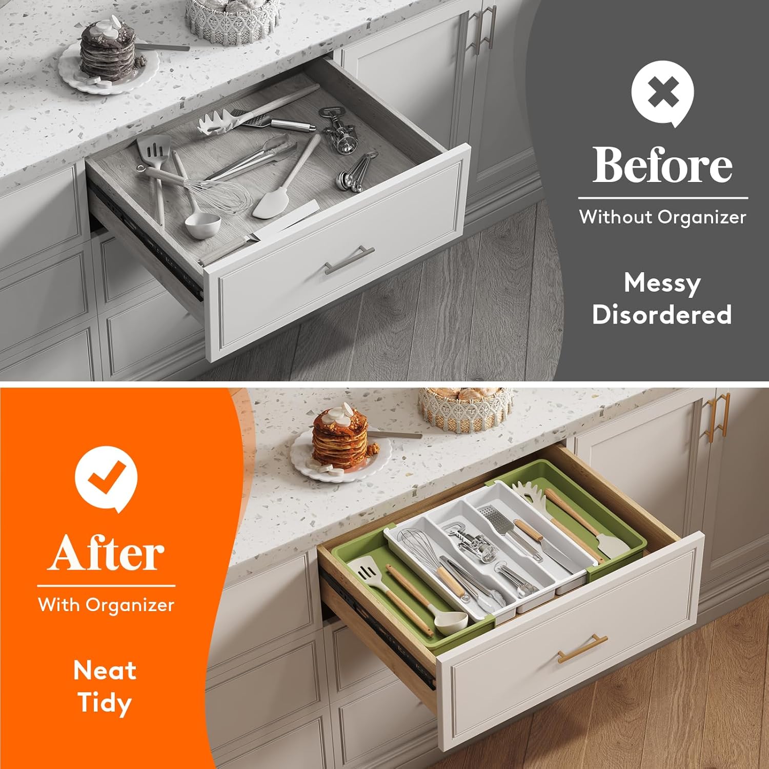 - Expandable and Adjustable: The utensil organizer for kitchen drawers can be expanded from 3 slots to 5 slots, offering extra storage space for utensils. It is adjustable to fit different drawer sizes, ranging from 13 to 22.4 inches wide. When folded, it measures 13" x 15" x 2", but expands to 22.4" x 15" x 2" for added space.