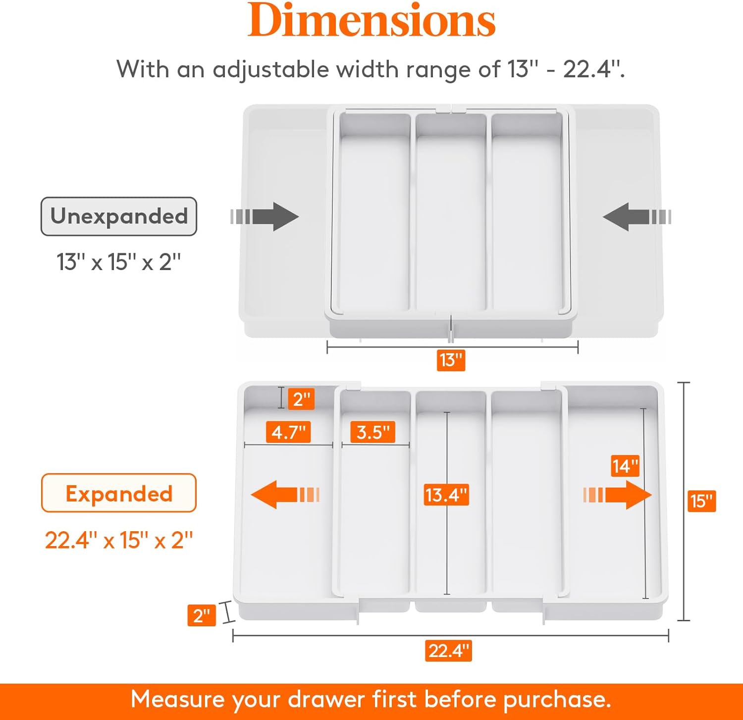 - Expandable and Adjustable: The expandable utensil organizer adjusts from 3 to 5 slots. Folded: 13"×15"×2"; expanded: 22.4"×15"×2". Stores utensils and silverware neatly. Note: Measure your drawer first before purchase