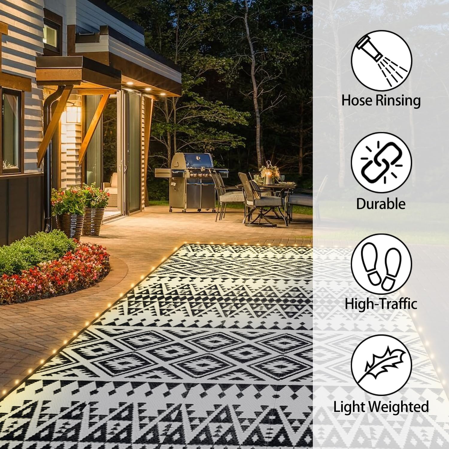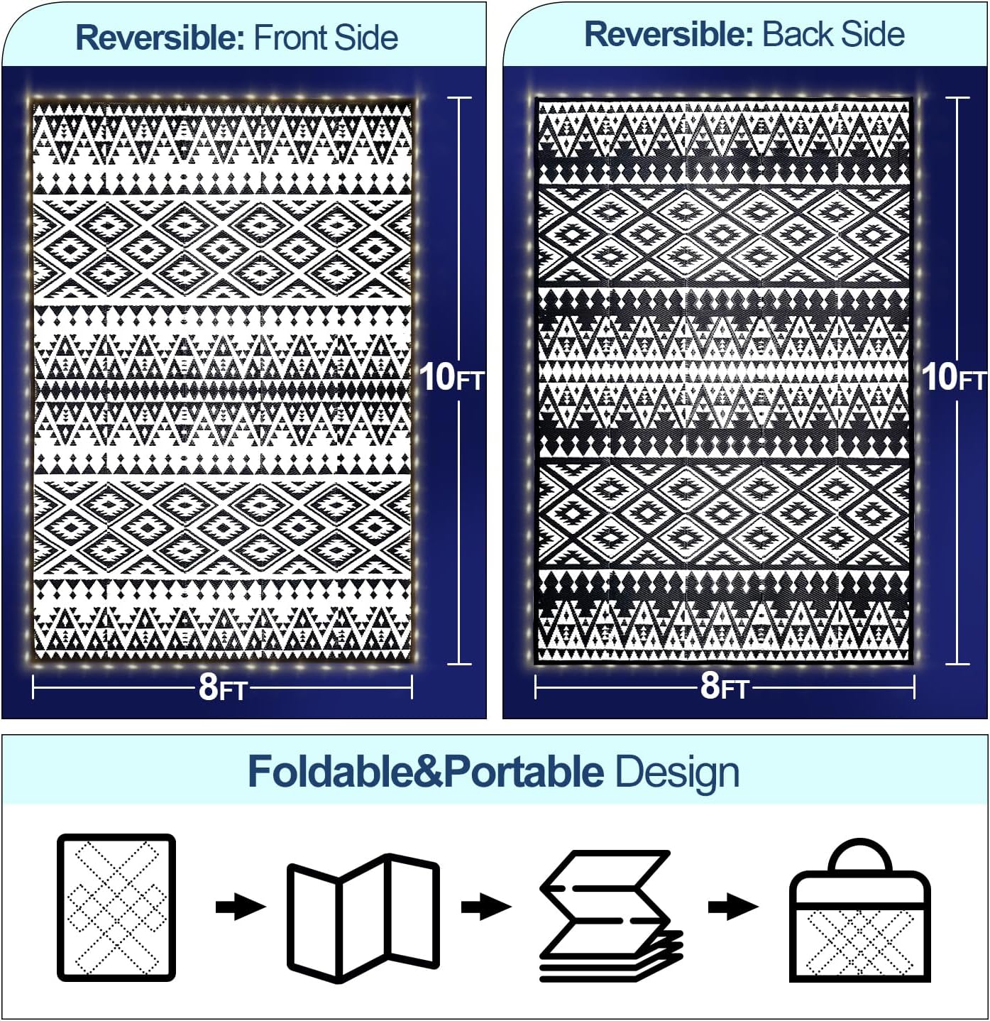 Outdoor Rug Mat with Led Strip Lights for Patio, 8x10ft Waterproof Reversible Plastic Straw Rugs, Camping Carpet Area Mats for RV, Porch, Deck, Backyard, Balcony, Camper, Black & White
