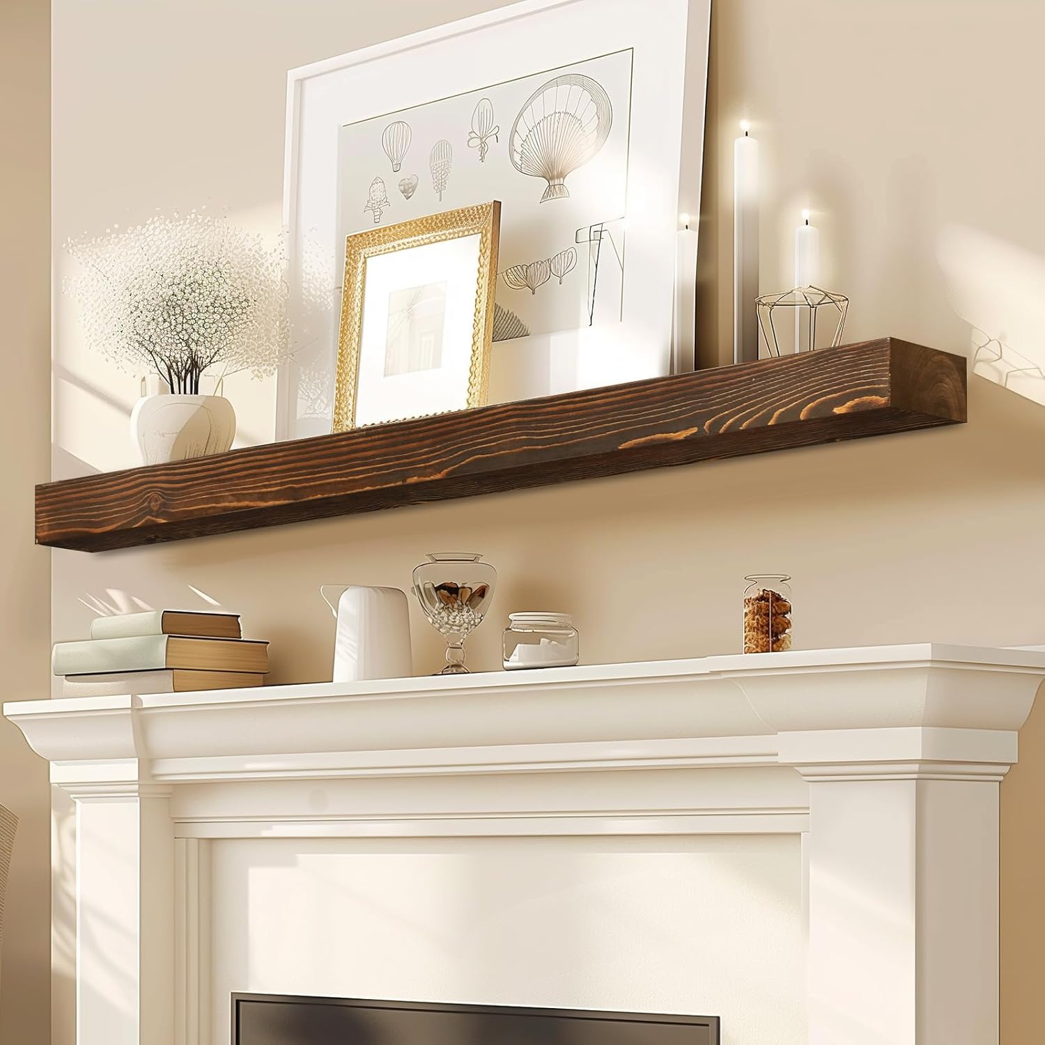 - Wall-Mounted Design: The fireplace mantels feature an elegant floating design, offering a clean and tidy appearance, making them the perfect choice for displaying decorations or storing daily items. These mantels are not only furniture, they are a lasting investment in the beauty of natural wood, carefully processed to suit your home even better