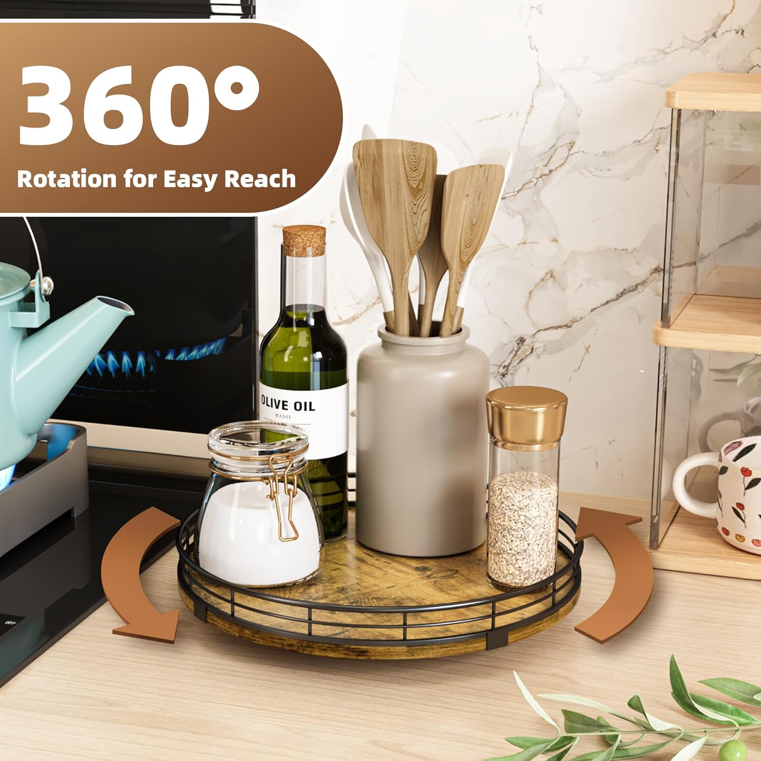 - 360°Smooth Rotation - The lazy susan turntable rotates smoothly and silently, placed next to the stove for easy access to condiments, spices, olive oil and cooking supplies. Placed next to the sink to display soap lotion. Thoughtful kitchen countertop organizers to rid your life of clutter!