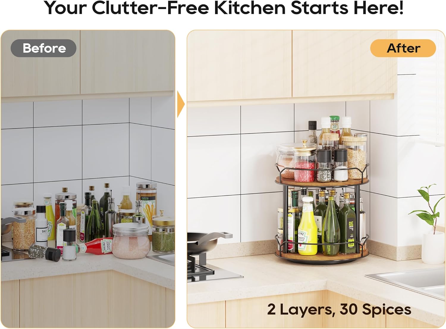 - 1. Stay Organized in Style: Ditch clutter and stay organized with our two-tier turntable Lazy Susan! This beautiful wooden rotating spice rack spinner is perfect for any table top, farmhouse bathroom decor, round decorative tray for your vanity, counter, sink, coffee table, and much more