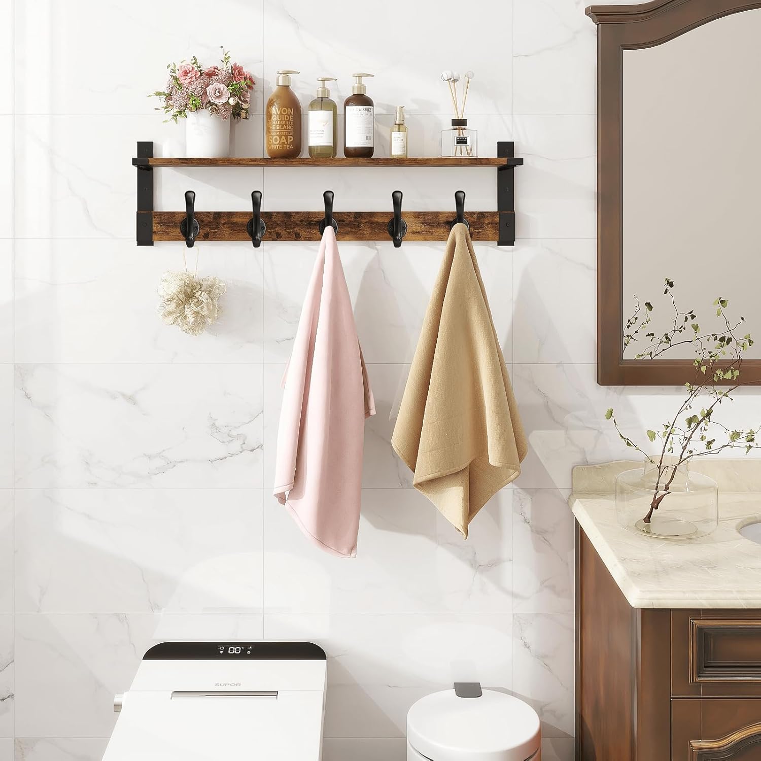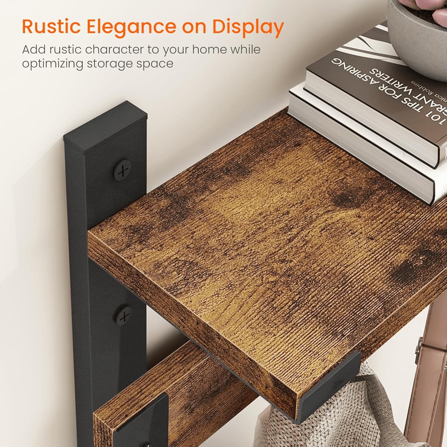 - VERSATILE USES: Beyond its primary function as a coat rack, this versatile shelf with hooks adds flair to your space. Ideal for entryways, mudrooms, living room or any space needing a blend of storage and style, accommodating various items without sacrificing elegance