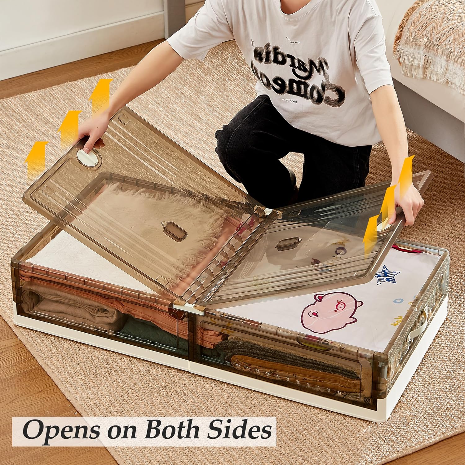 - 【High Quality Under Bed Storage】The stackable storage boxes are made of high-quality PP material, ensuring durability and waterproof performance. Additionally, the under-bed storage containers features a two-way opening design with a dustproof cover. The ends of the cover have locking buckles to secure it, the storage boxes providing better protection for your items.