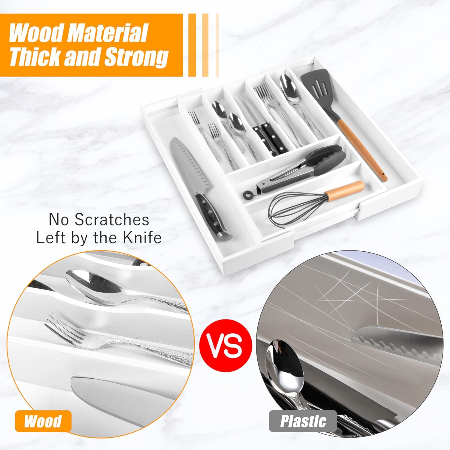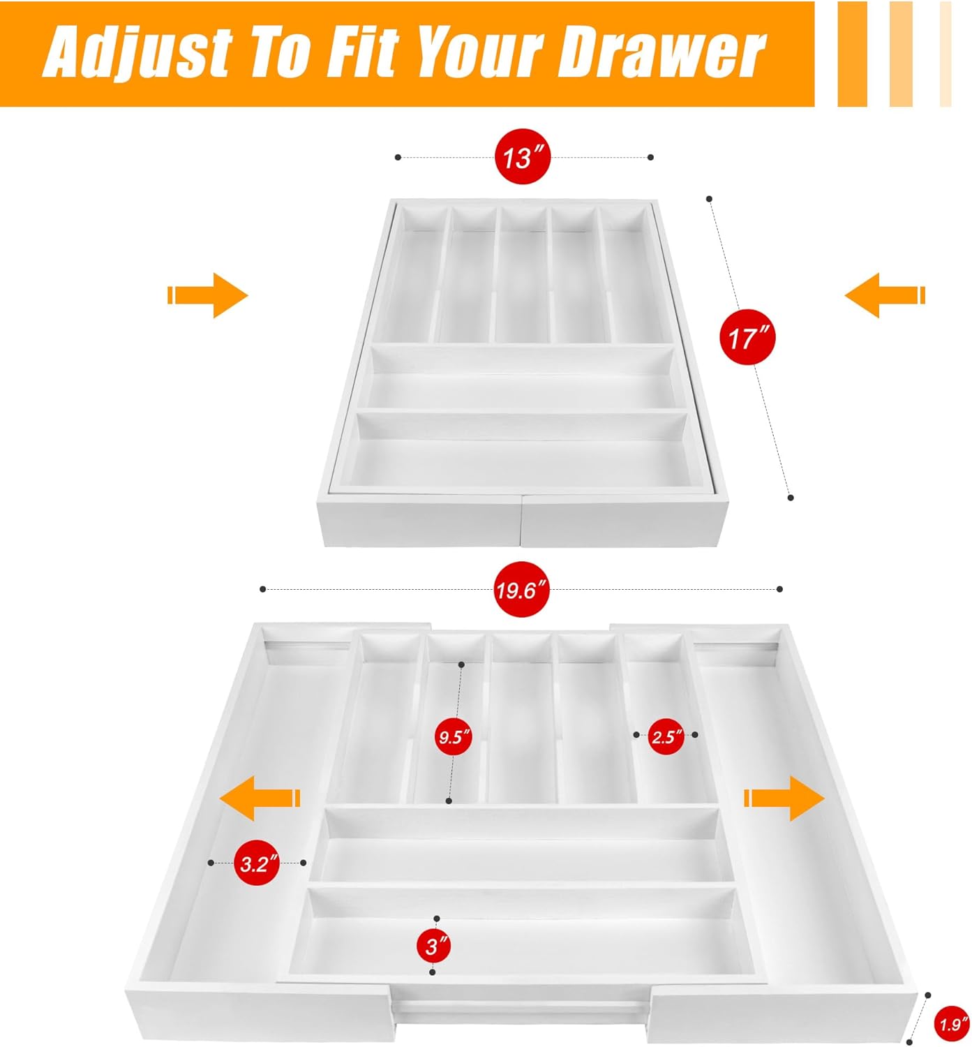 Bellsal Large Premium Bamboo Silverware Organizer - Expandable Utensil Drawer Organizer - 17"x19.6" Utensil Holder and Cutlery Tray with Grooved for Kitchen Flatware and Utensils(7-9 Slot, White)