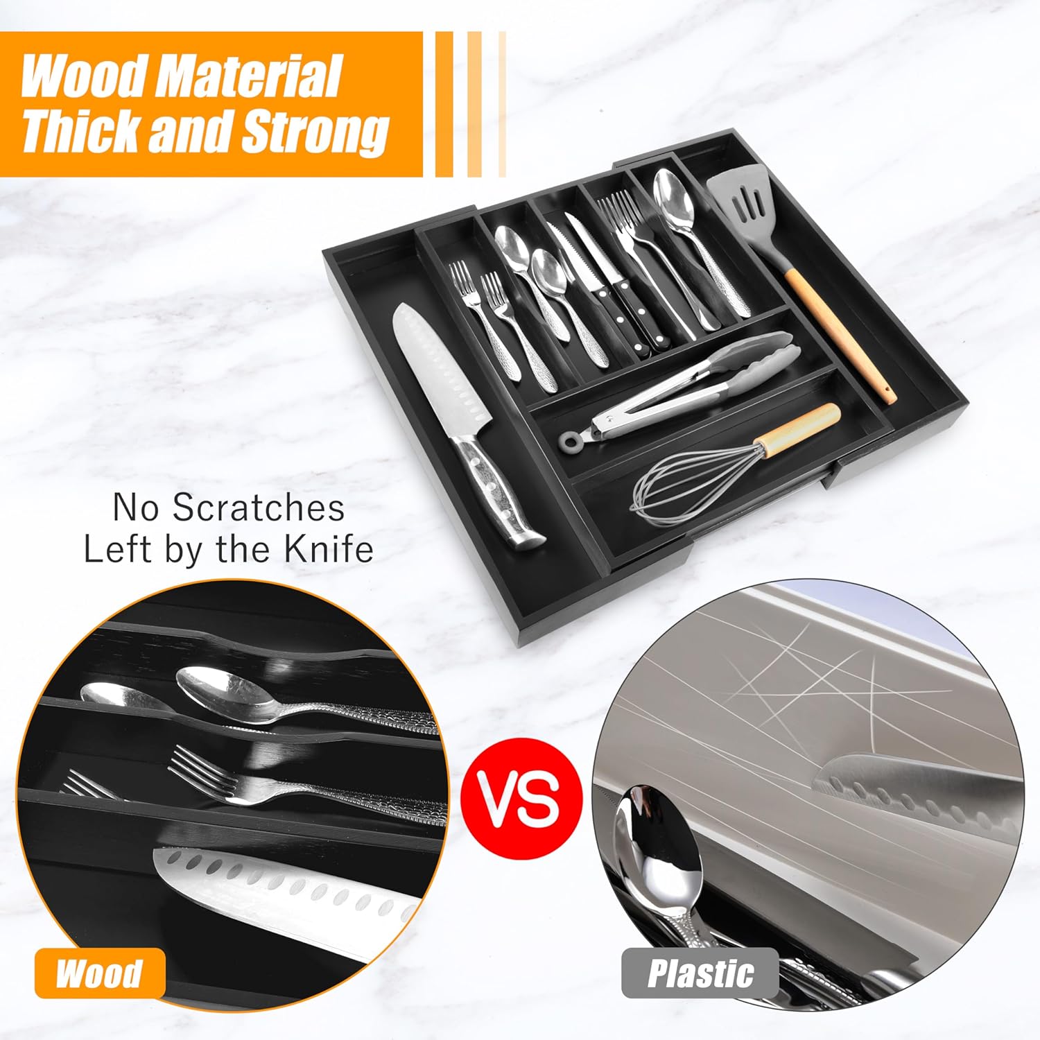 - ✅【Expandable - fit most kitchen drawers.】Our large utensil silverware drawer organizer flatware cutlery tray are adjustable in width, expanding from 17"x13" to 17"x19.6" as needed, with a depth of 1.9" . The utensil silverware drawer organizer is crafted from natural bamboo that has been grown for over 4 years. Each silverware drawer organizer made of bamboo is meticulously handcrafted by seasoned artisans to ensure a smooth, smooth surface. You can confidently allow your family or children to use our silverware drawer organizer.