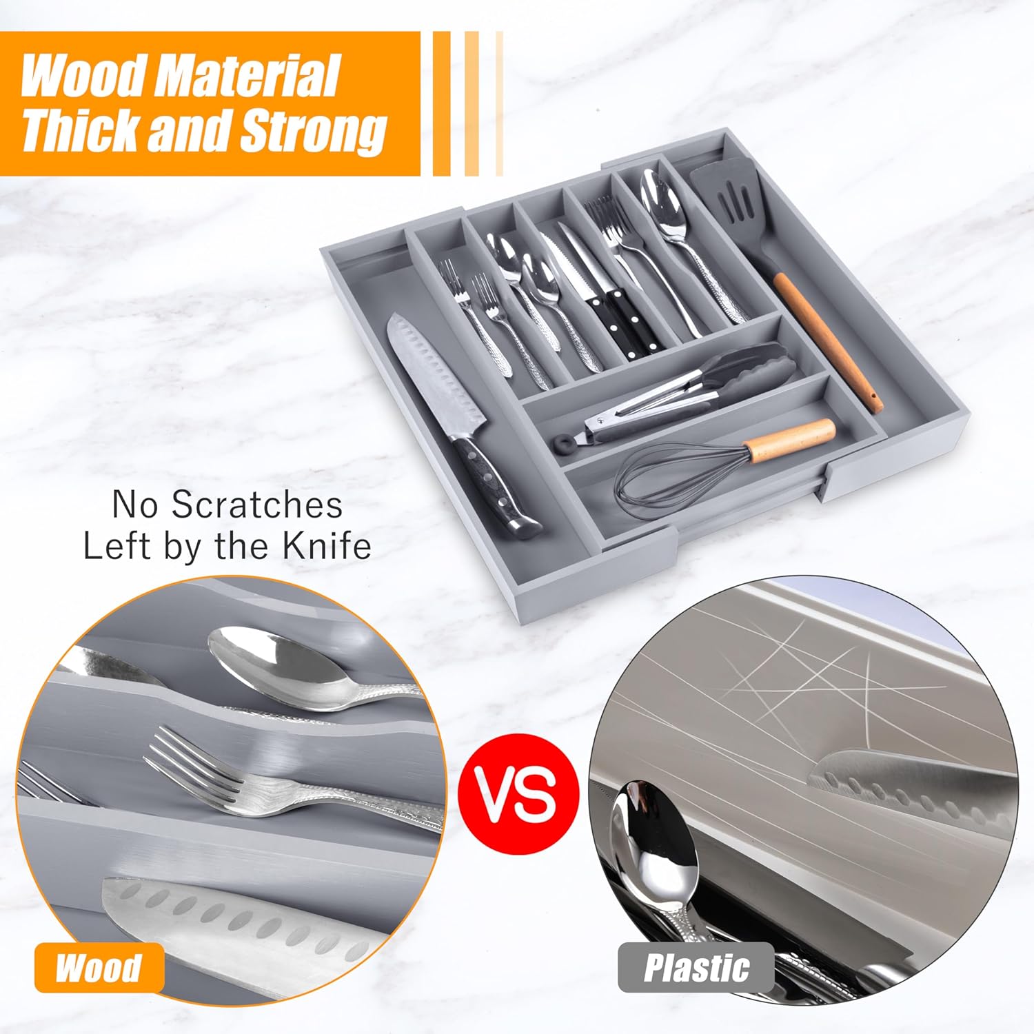 - ✅【Expandable - fit most kitchen drawers.】Our large utensil silverware drawer organizer flatware cutlery tray are adjustable in width, expanding from 17"x13" to 17"x19.6" as needed, with a depth of 1.9" . The utensil silverware drawer organizer is crafted from natural bamboo that has been grown for over 4 years. Each silverware drawer organizer made of bamboo is meticulously handcrafted by seasoned artisans to ensure a smooth, smooth surface. You can confidently allow your family or children to use our silverware drawer organizer.