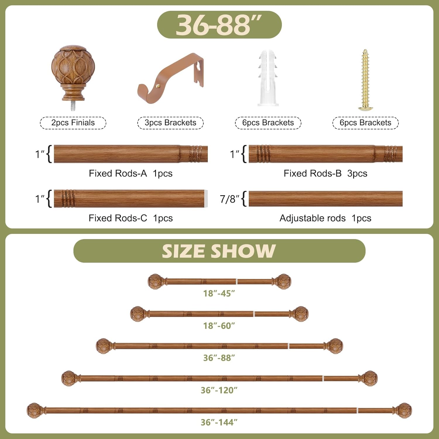 - Curtain Rods for Windows 48 to 84 inch(4-7ft): TANGWIN drapery rods include 4 x 16" x 1" fixed rods, 2 x 16" x 7/8" adjustable rods, 2 x finial,3 x bracket, 3 x connector, 6 x anchor, 6 x screw. Wood curtain rods for windows can extend from 36 to 88 inches, choose the right size curtain rods according to the length of your window.