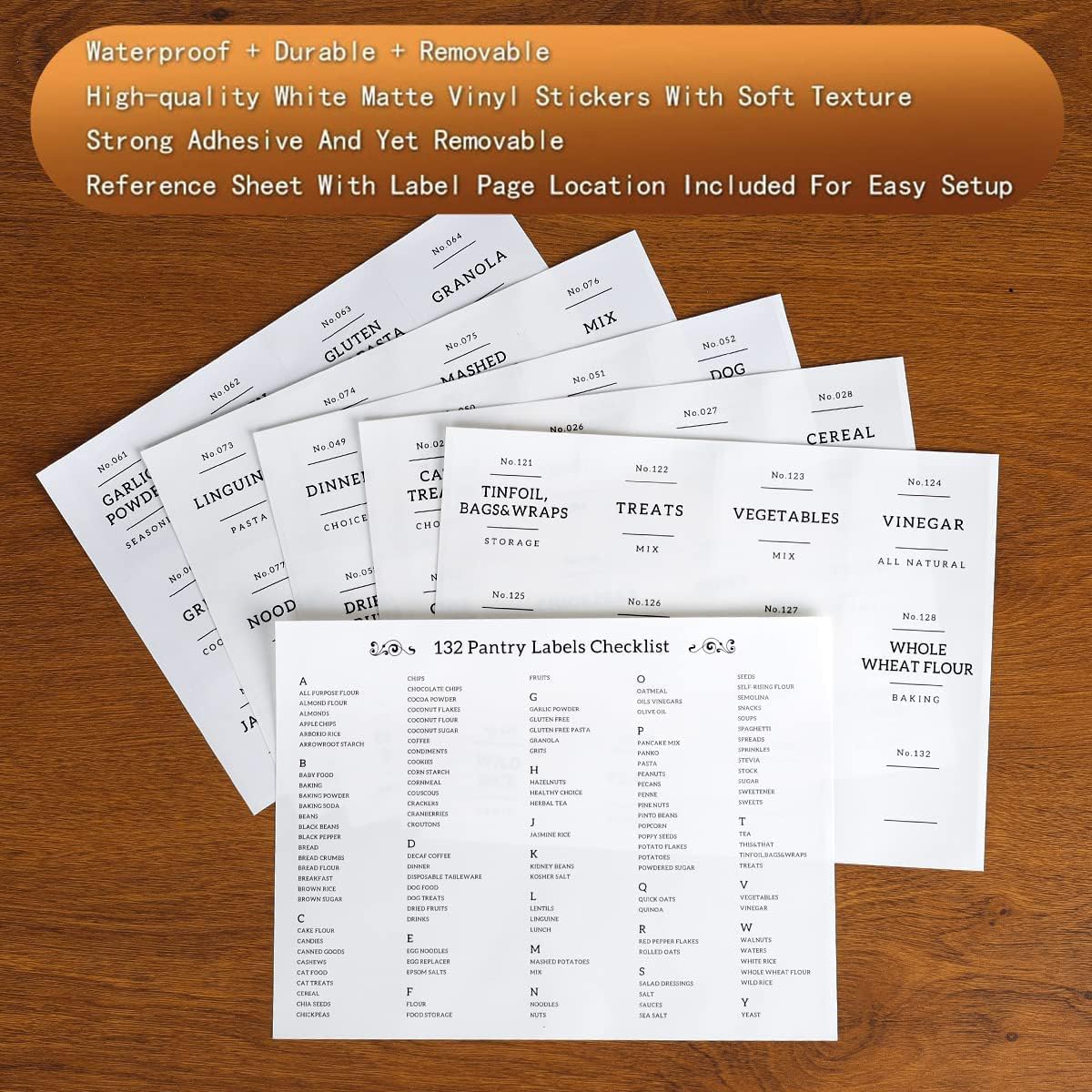 - 【PERFECT FOR PANTRY】132 Kitchen pantry labels for glass pantry storage containers with lids to keep your food fresh and pantry tidy. Minimalist labels are black text on white food labels stickers suitable for all airtight glass canisters. Pantry decal organization labels are preprinted on premium waterproof vinyl stickers that won't tear or peel off but can easily be removed.