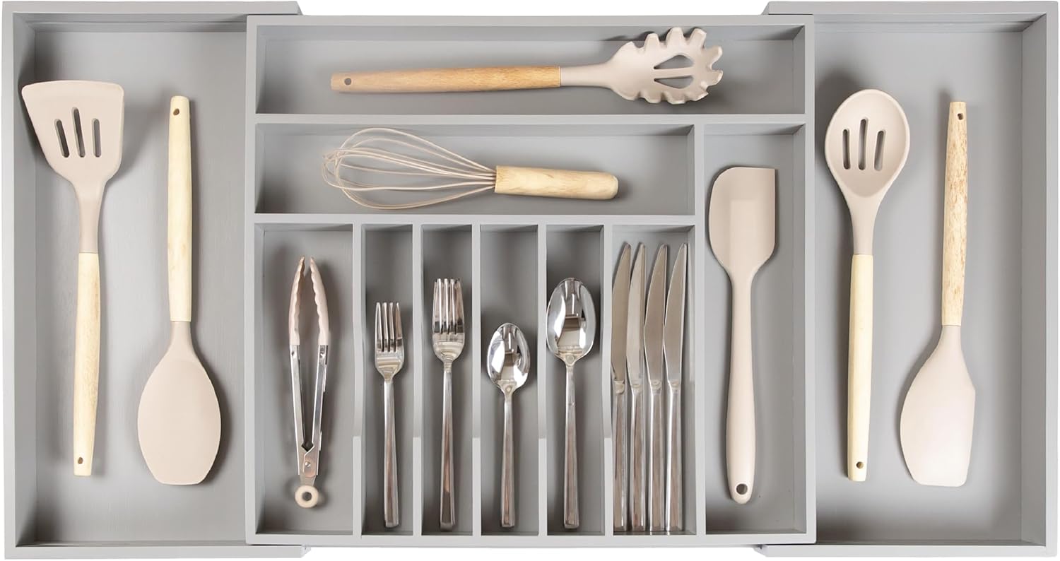 - MAXIMIZE YOUR DRAWER’S STORAGE CAPACITY: This 11-compartment (9 fixed + 2 adjustable) gray organizer measures 17.25” long x 2.7” tall and expands from 18” to 33” wide (and any width in between). Most other flatware organizers expand to 22” or 23” wide and are only 2” tall. It’s amazing how much storage capacity an extra 0.7” in height adds when filling your organizer full of flatware and utensils!