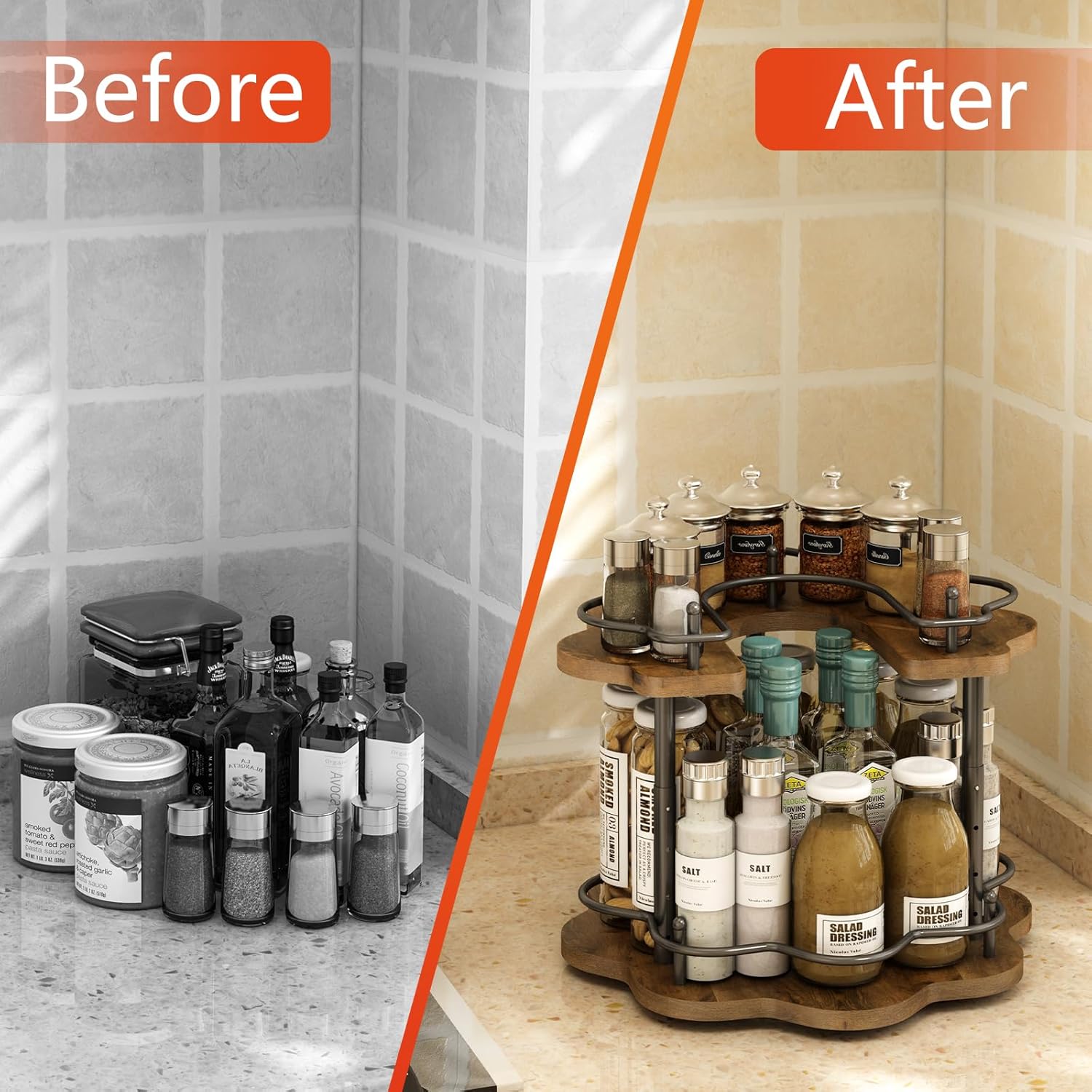 - 【Quality Materials】This 2-Tier Lazy Susan Organizer is made of vintage solid wood and metal and is very sturdy and durable. Unlike ordinary wood, it has a special coating that makes it waterproof and heat-resistant, so it can be used in a variety of scenarios and is much easier to clean.