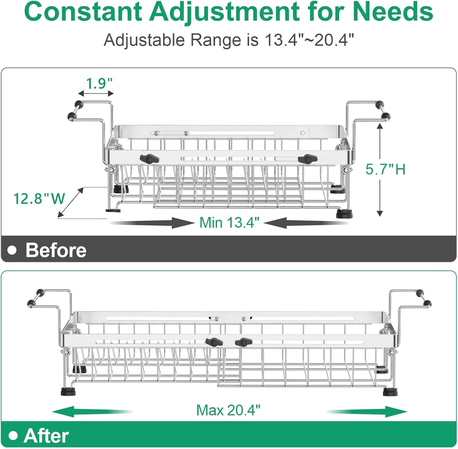 GSlife Expandable Sink Dish Drying Rack - Stainless Steel Capacity Adjustable Over The Sink Dish Rack (13.4''-20.4'') with Sink Mat and Utensil Holder, Silver