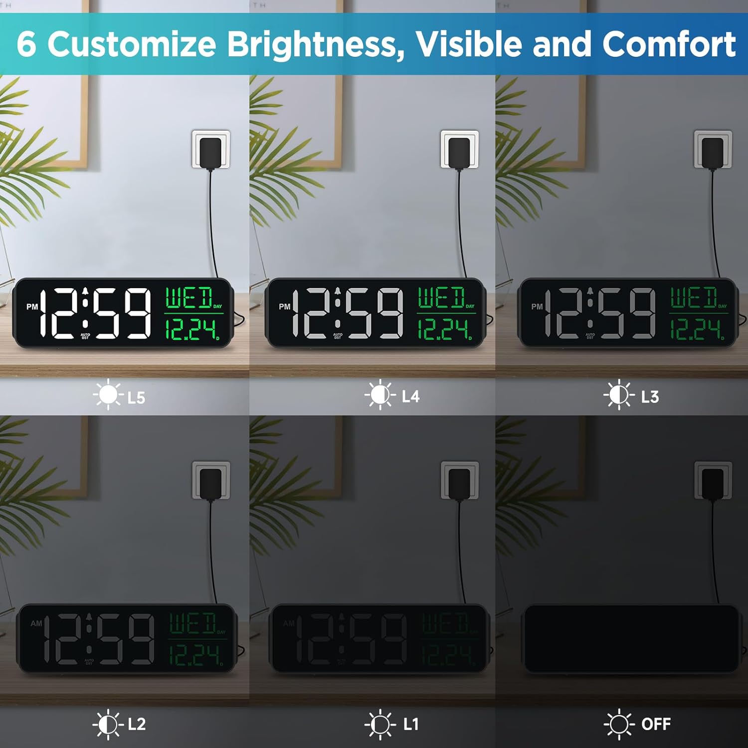 - 𝐋𝐚𝐫𝐠𝐞 𝐍𝐮𝐦𝐛𝐞𝐫𝐬 𝐰𝐢𝐭𝐡 𝐀𝐝𝐣𝐮𝐬𝐭𝐚𝐛𝐥𝐞 𝐁𝐫𝐢𝐠𝐡𝐭𝐧𝐞𝐬𝐬: 2-inch height of large numbers are friendly for seniors / elderly and people with poor eyesight. 5 different brightness settings ensure clock time is always visible in various lighting conditions: brighter and comfort in day or lower brightness at night for an improved sleep or completely off at night.