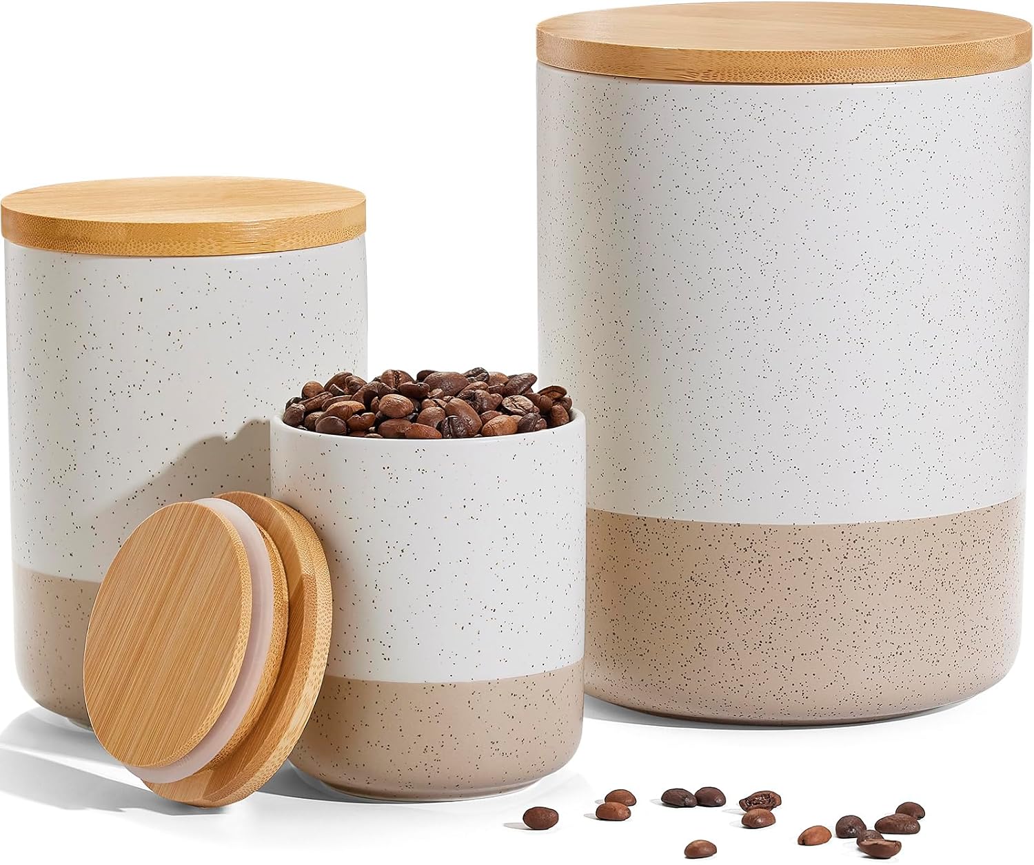 Yangbaga Canister Sets for Kitchen Counter, 80/40/20 OZ Large Ceramic Food Storage Jars with Airtight Wood Lids, Large Kitchen Canisters for Coffee, Sugar, Tea, Flour, Spice