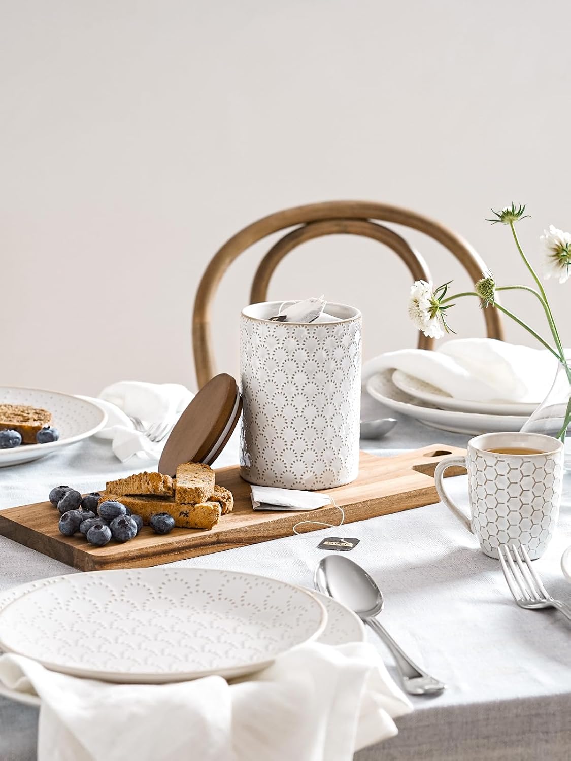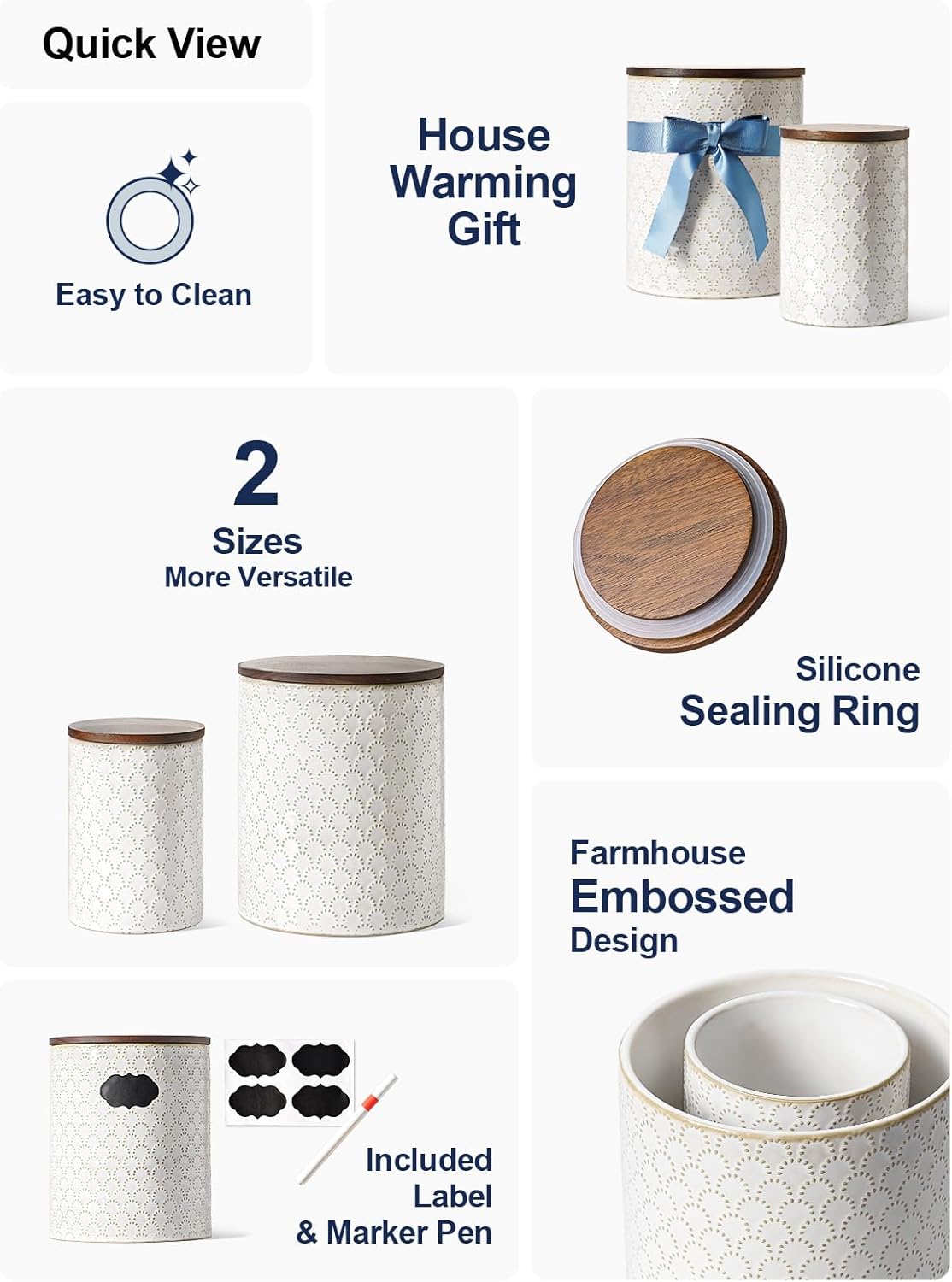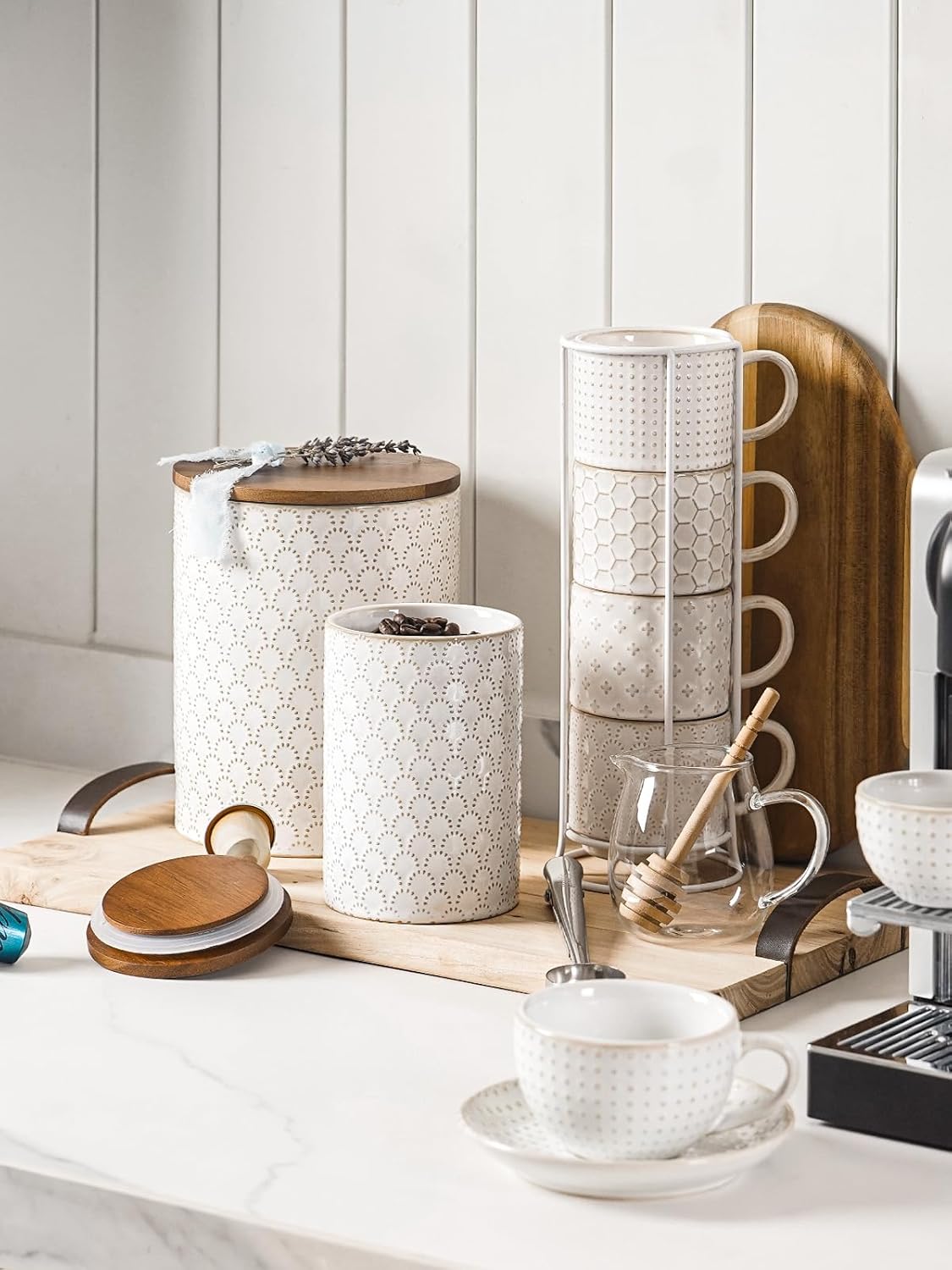 - Embossed Design: Featuring an arctic white glaze with a charming embossed pattern, these farmhouse-style ceramic jars will add warmth and vitality to your home. Their elegant design complements various home styles, making them the perfect addition to your countertop or coffee corner. Enhance your home’s aesthetics and let these jars become a standout decorative element in your living space