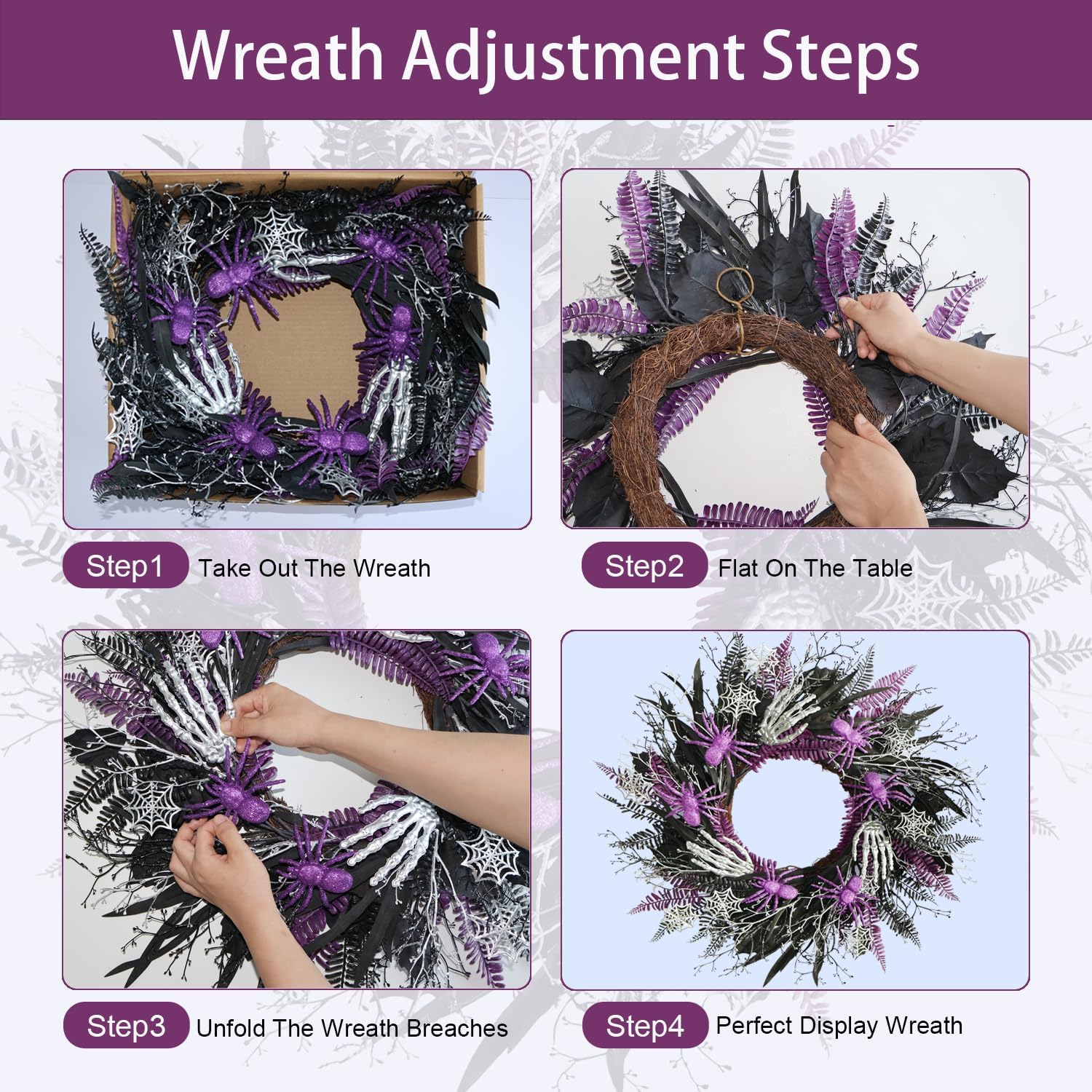 - 🎃 Festive Halloween Wreath: Celebrate Halloween with this 20-inch wreath adorned with black & purple leaves, purple Spiders Silver Skeleton Hands, creating a gothic and spooky ambiance.