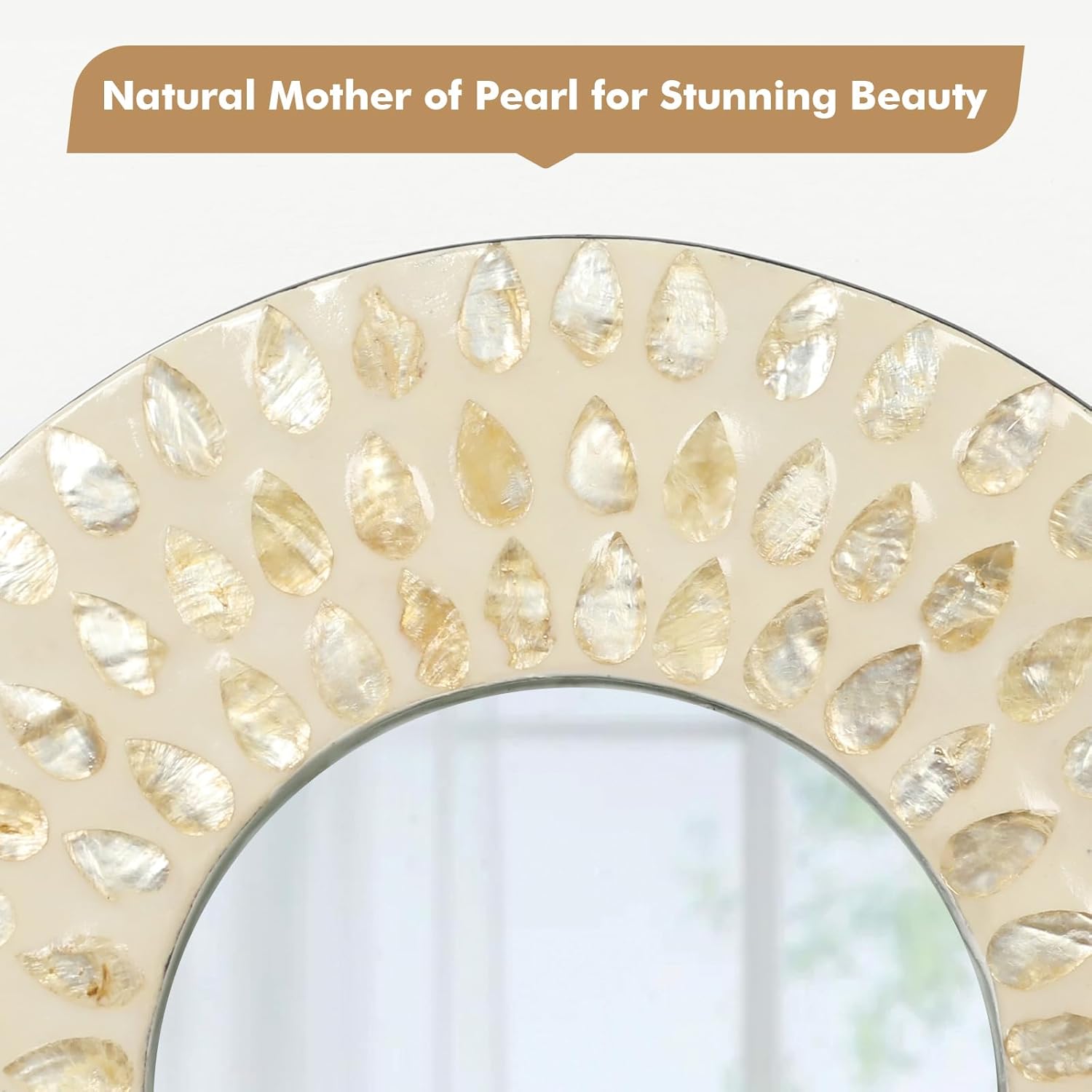 - HANDMADE, NATURAL WALL DECOR - Handcrafted from real mother of pearl by our experienced craftsmen, this unique mirror wall art set adds distinctive flair to your living or working space. Light, airy tone makes this wall mounted mirror fit in boho, coastal, modern, farmhouse and any other styles nicely, delivering maximum comfort and tranquility. [Note: Because the cut pieces are put on individually by hand, items received may be slightly different from pictures shown]