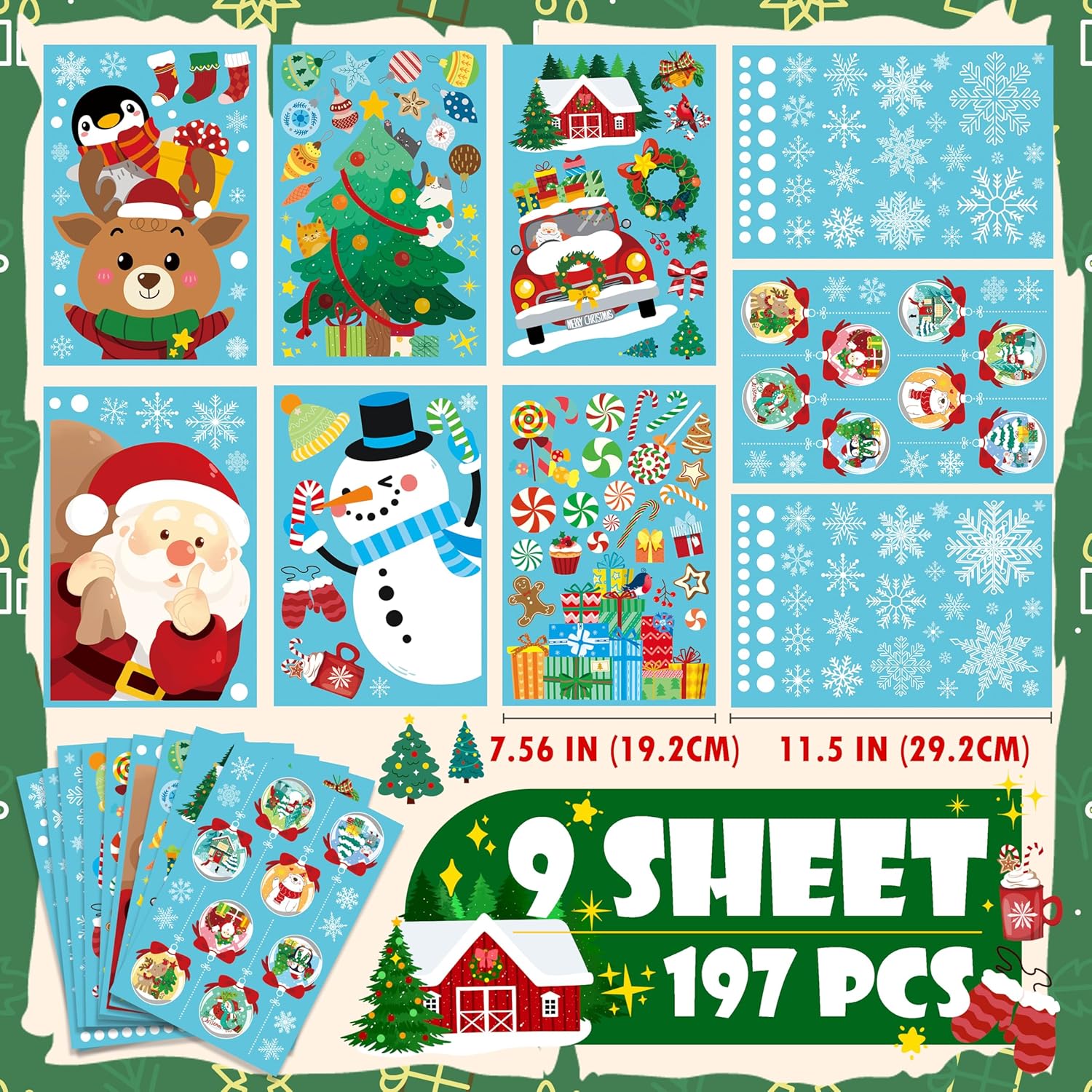 - CUTE LARGE CHRISTMAS WINDOW CLINGS STICKERS - 197 PCS (9 SHEET - 7.87 x 11.81 in). KAHSHEEN window clings are rich in patterns, cute, and unique, with bright colors and a large coverage area. The alternating small and large designs make them suitable for windows and glass doors of different sizes. The dancing snowflakes, Santa Claus, reindeer, snowmen, Christmas trees, gifts, candies, and other patterns can meet your needs for winter or Christmas decorations.