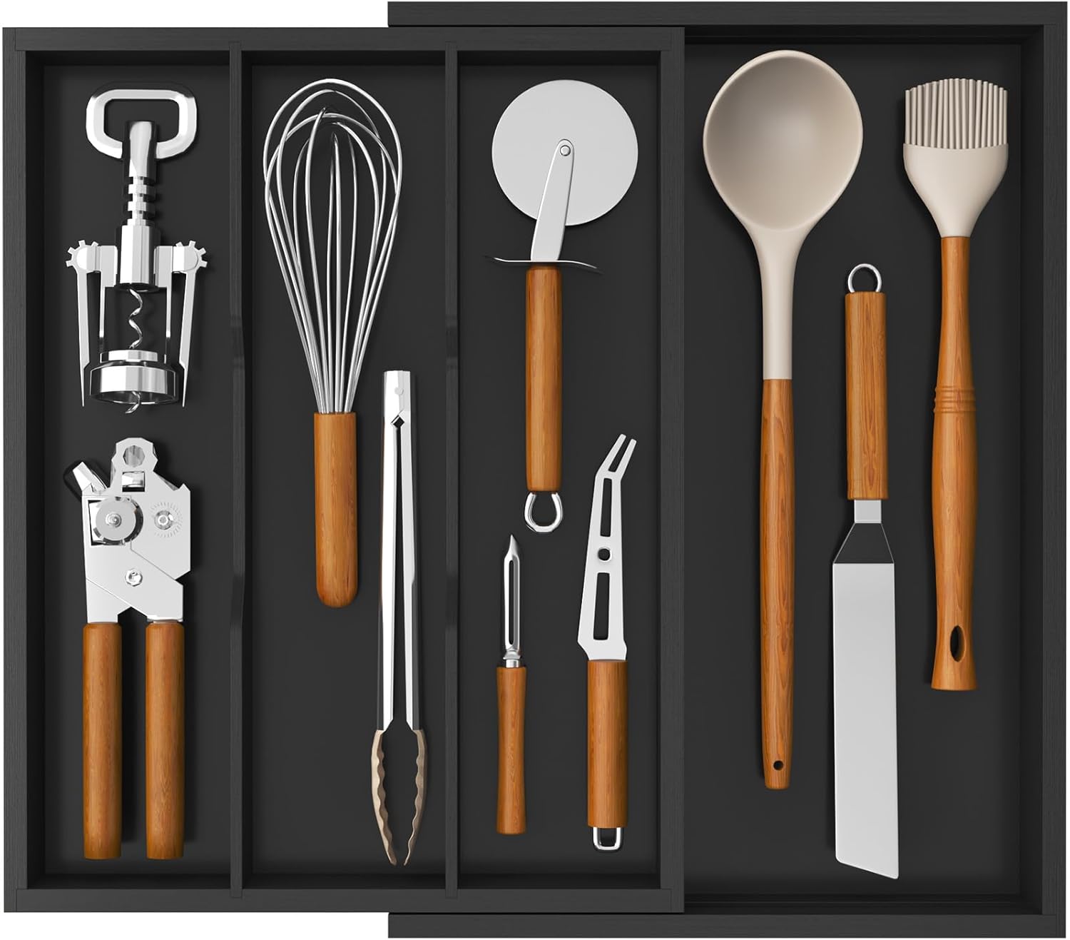 Lifewit Utensil Drawer Organizer, Expendable Cooking Silverware Tray for Kitchen Drawer, Bamboo Adjustable Cutlery Flatware Holder, Spatula Tools and Gadgets Storage Divider, 4 Compartments, Black