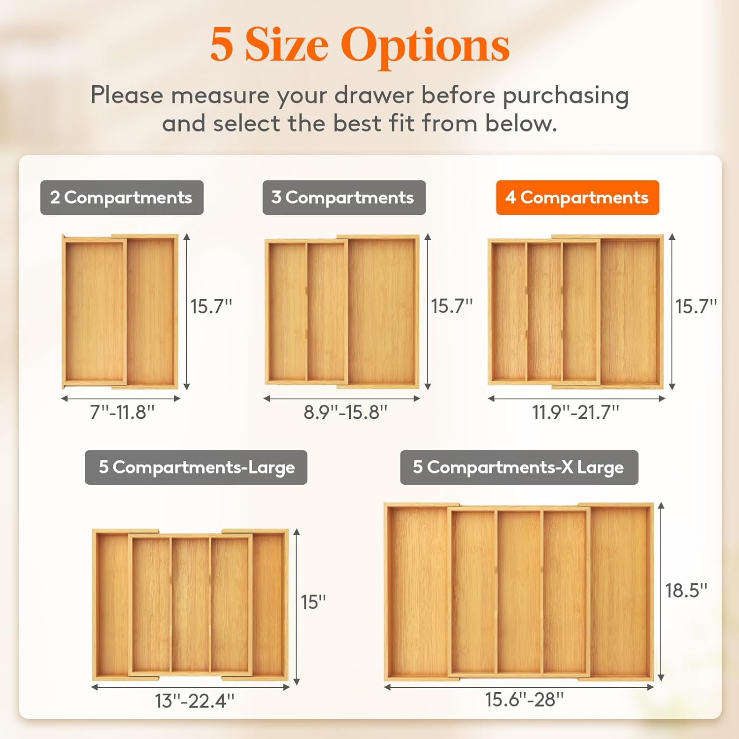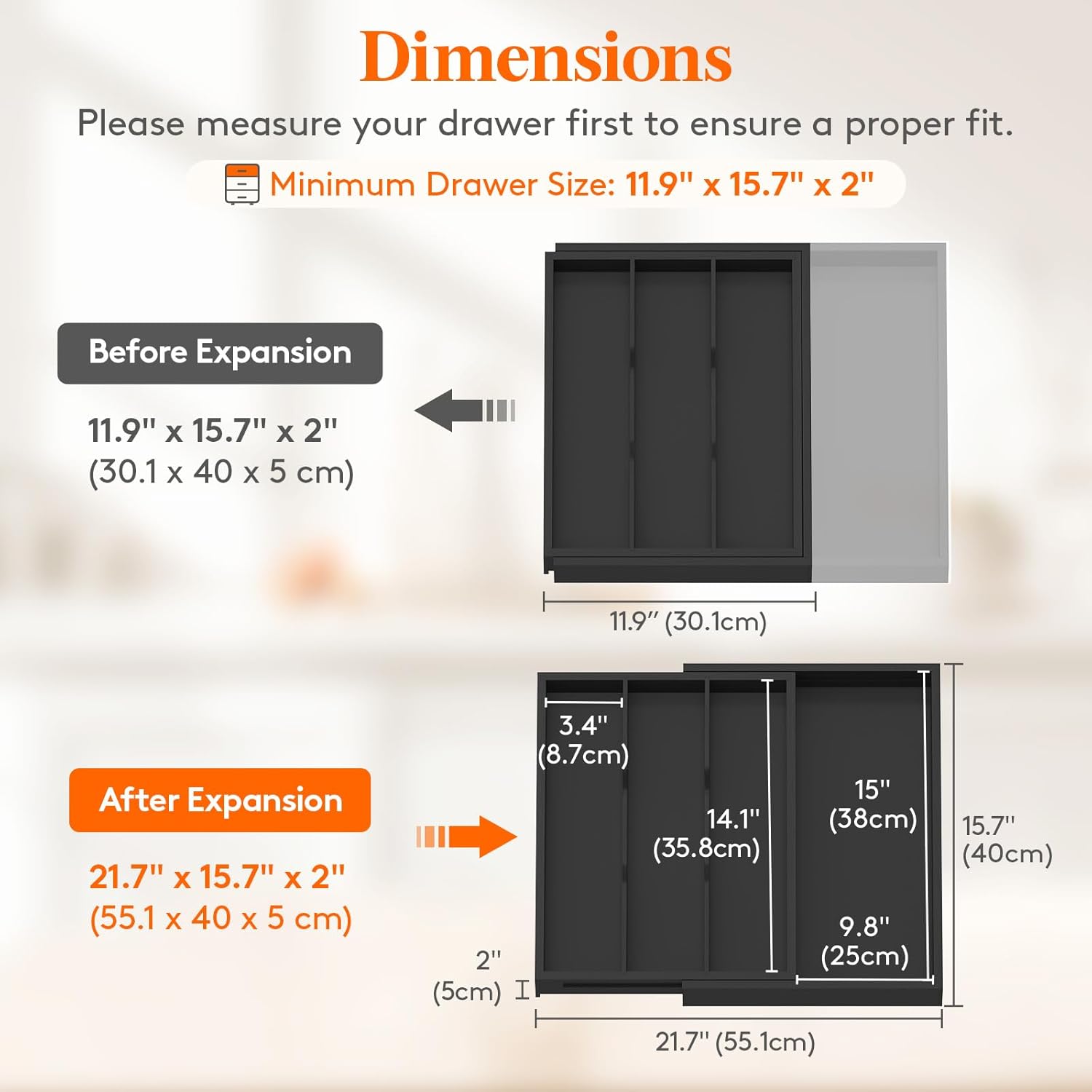 - Expandable Design: This utensil drawer organizer expands from three to four compartments and measures 21.7 x 15.7 x 2 inches (55.1 x 40 x 5 cm) after expansion, providing extra storage space. Its adjustable width range (11.9 - 21.7 inches) ensures a perfect fit for most drawers