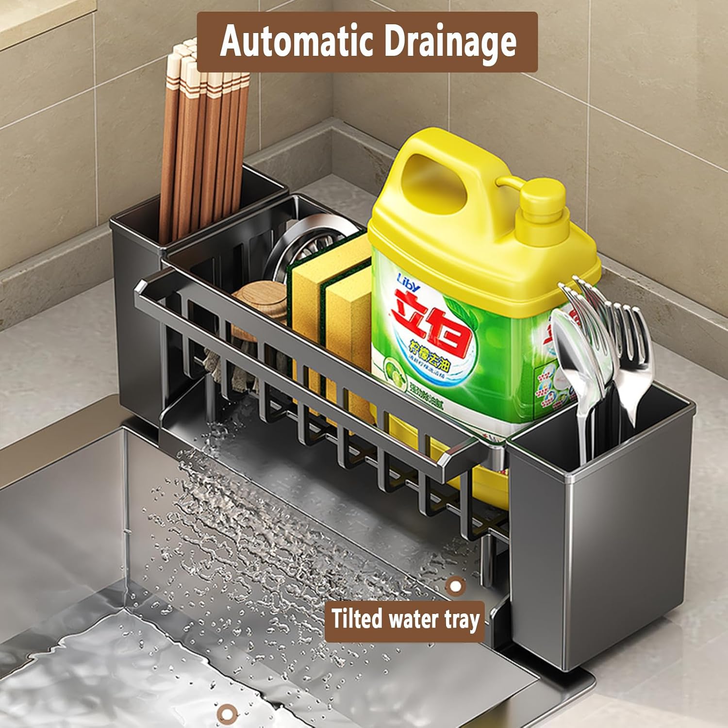 - Perfect Self-Draining Tray Design:This kitchen sink caddy features a self draining tray design that quickly drains water into the sink, helping your cleaning tools dry faster and stay clean.